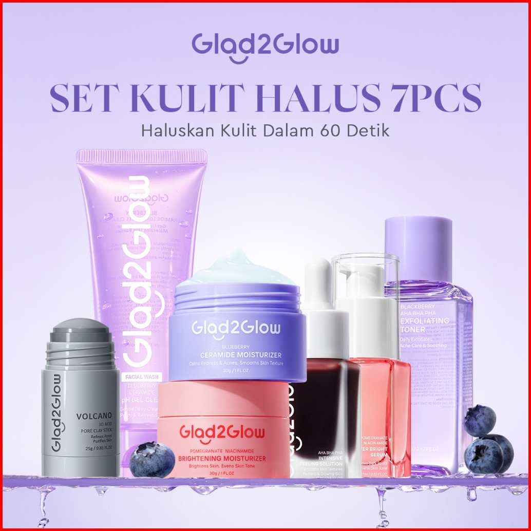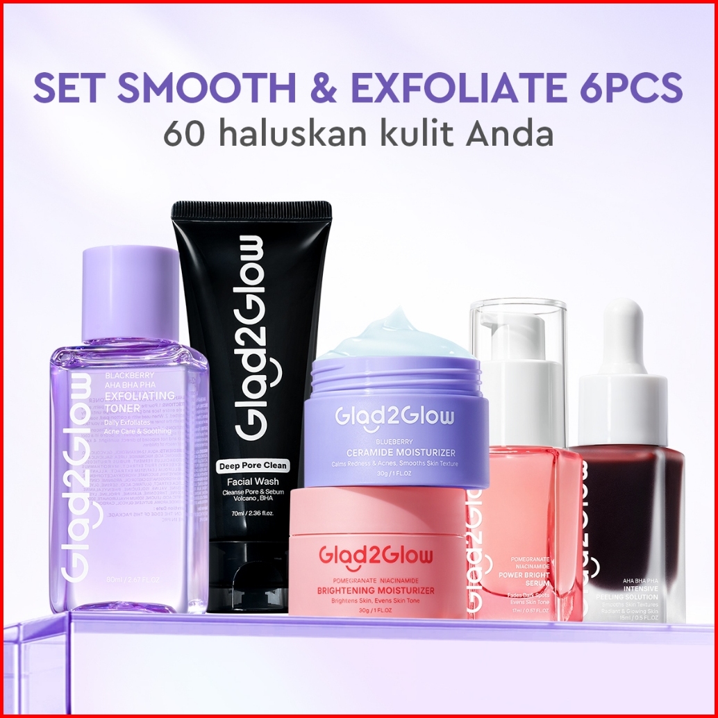Hemat 60k Glad2glow Kulit Halus Bundle 7in1 Eksfoliasi Wajah Skincare Set-pulihkan Cerah Krim Glowing Serum Peeling Solu