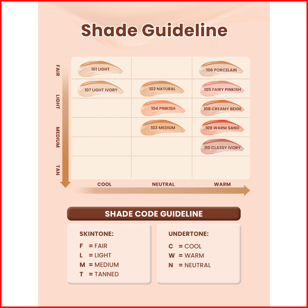 101 Light, 102 Natural, 103 Medium, 104 Pinkish, 105 Fairy Pinkish, 106 Porcelain, 107 Light Ivory, 108 Creamy Beige, 109 Warm Sand, 110 Classy Ivory
