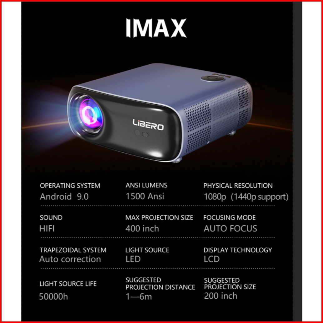 Libero Proyektorlife Series Imax- 1500 Ansi 1440p- Android 9.0 Smart Proyektor- Netflix Youtube Googleplay- A5 Chip- 3d