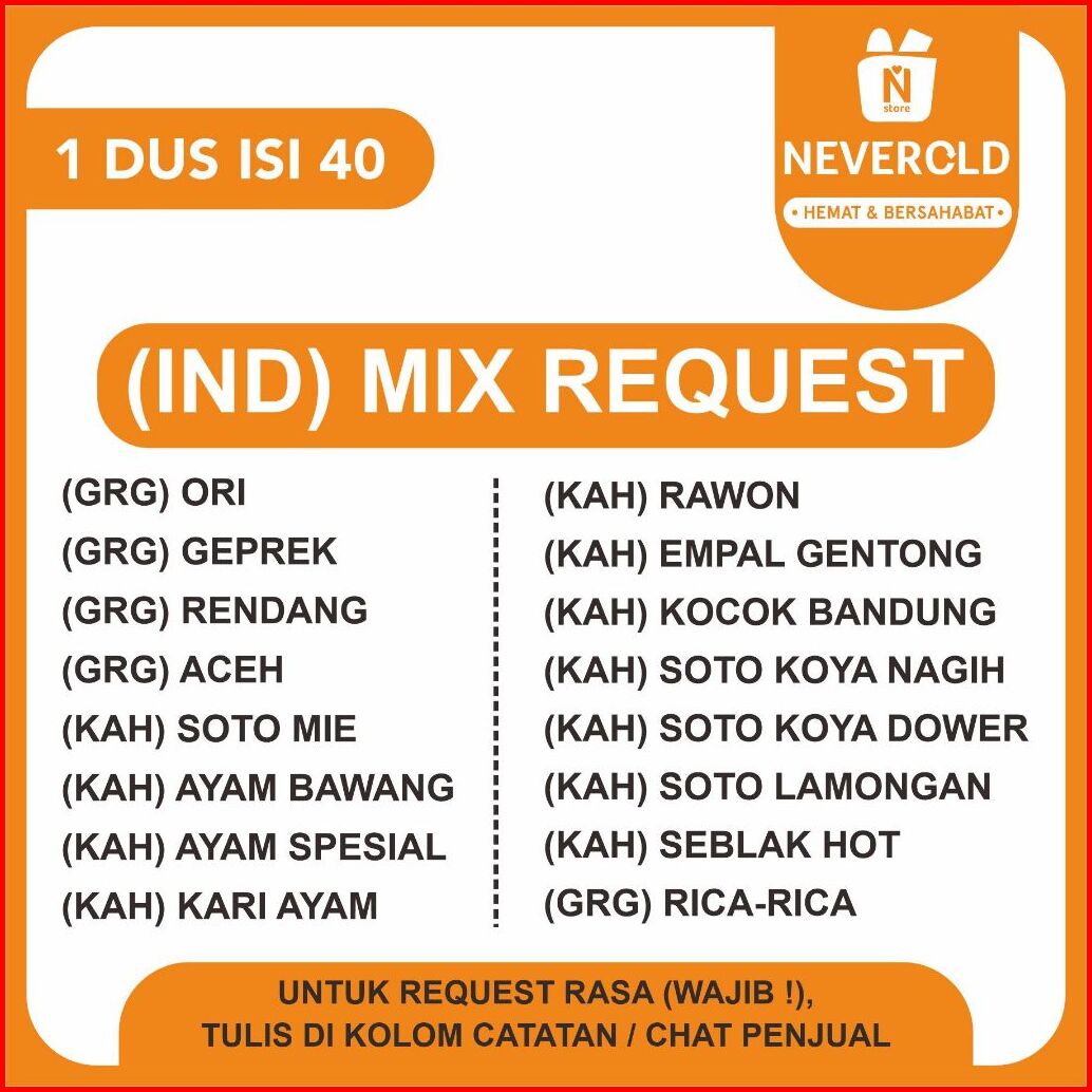 (IND) MIX REQUEST, (IND) MIX 8 VARIANT, (IND) GORENG, (IND) SOTO, (IND) AYAM SPESIAL, (IND) AYAM BAWANG, (IND) RENDANG, (IND) KARI AYAM, (IND) AYAM GEPREK, (IND) GORENG ACEH, (IND) SEBLAK HOT, POPMIE MIX, POPMIE AYAM, POPMIE SOTO, POPMIE BASO, POPMIE KARI, (IND) RAWON MERCON, POPMIE GORENG ORI, (IND) SOTO NAGIH, (IND) SOTO DOWER, (IND) MIX KUAH 4 VAR, (IND) MIX GRNG 4 VAR, (IND) MIX KULINER, (IND) GR, KR, ST, AB, (IND) GR, ST, AB, (IND) GR, ST, (IND) GR, AB, (IND) GR, KR, (IND) BANGLADESH'E, (IND) KOCOK BANDUNG, (IND) EMPAL GENTONG