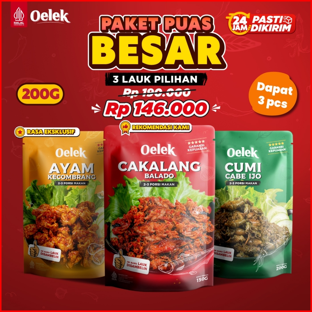 Oelek Paket Puas Besar 3 Lauk Pilihan Cumi Cabe Ijo Ayam Kecombrang Cakalang Balado Lauk Siap Saji Lauk Pedas