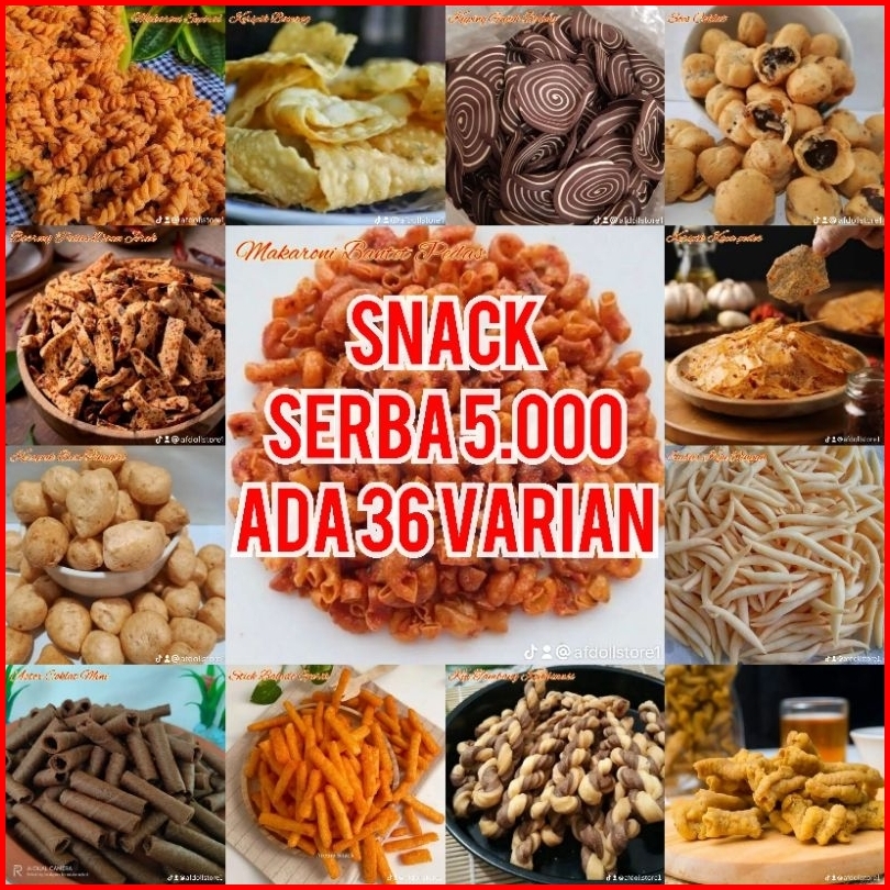 Kentang Balado, Keripik Bawang, Pilus Ikan, Gemros, Kuping gajah, Astor cokla, Spiral Balado, Makaroni bantet, Stik balado, Gabus keju, Kue tambang, Kerupuk Bakso ikan, Basreng pedas, Kentang Keju, Pangpang, Kacang telor, Singkong Pedas Manis, Soes coklat, Stik talas, Sale Lidah, Pisang manis, Tahu Walik, Sumpia, Snack tidak remuk, Singkong Asin, Tempe Sagu, Emping, Keripik Kaca, Keripik Usus, Lumpia Pisang Aroma, Semprong wijen, Emping Jagung, Cimol pedas, Stik Potato, Tempe Goreng, Pisang coklat, Stik Bawang, Seblak kencur, Combring, Sale jari, Stik pedas nadya, Sale kering