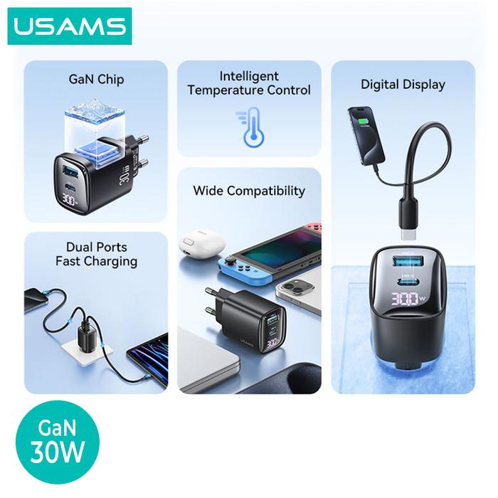 USAMS XC Series Adapter Fast Charger GaN A+C 30W Digital Display