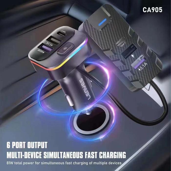 LENYES CA905 81W RGB Light Car Charger Mobil Fast Charging 6 Port Extended Type C USB