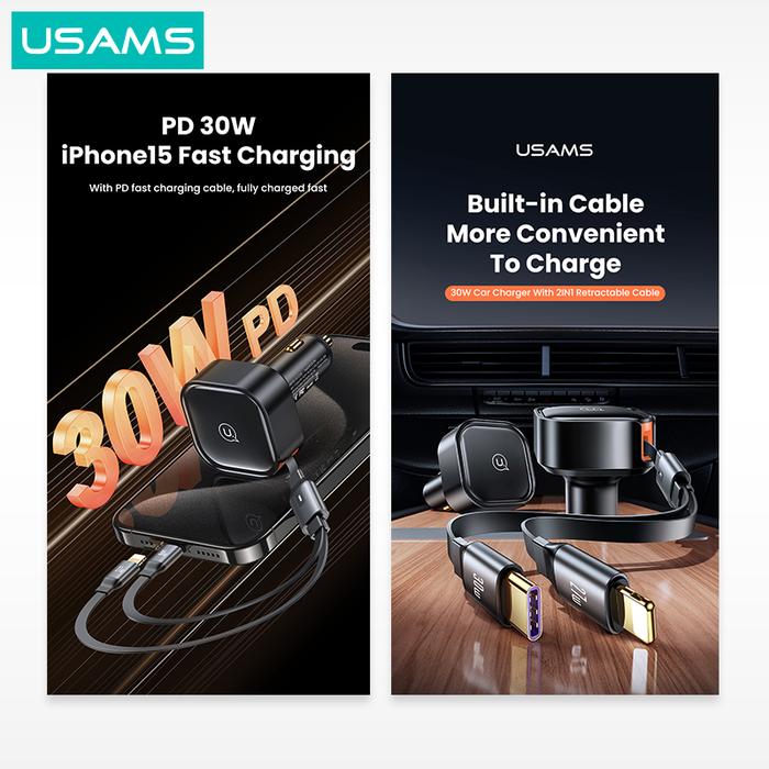USAMS C41 Car Charger Mobil 2in1 Retractable Cable Type C Lightning 30W