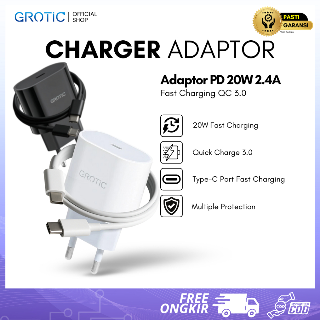 GROTIC Charger Adaptor PD 20W 2.4A Kepala Charger Fast Charging QC3.0 Type-C Lightning