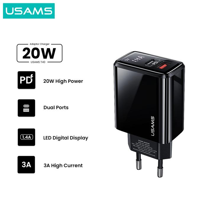 USAMS T40 Adapter Charger Fast Charge Digital Display QC3.0 PD 20W