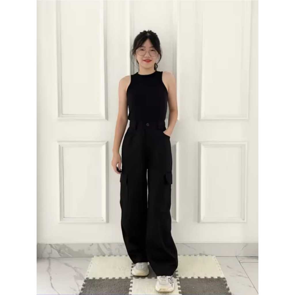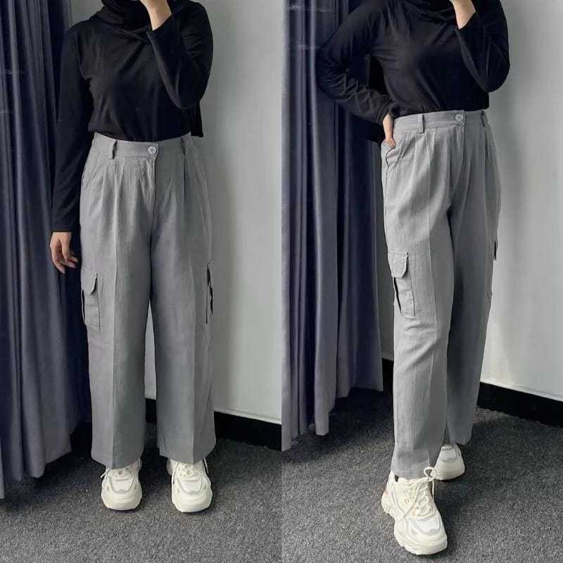celana baggy Celana Cargo Wanita Highwaist Jumbo Pinggang aret orean Style Bahan Drill Terlaris