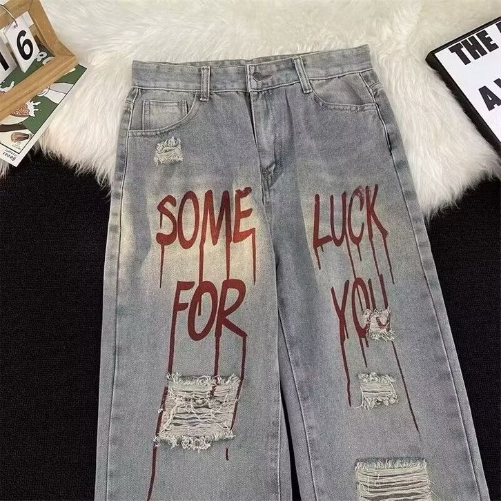 TERLAKU GIO SPORT - Jeans UNISEX-Jeans Robek-Jeans Kaki Lebar Modis Gaya Korea-Jeans Pinggang Tinggi Bermotif
