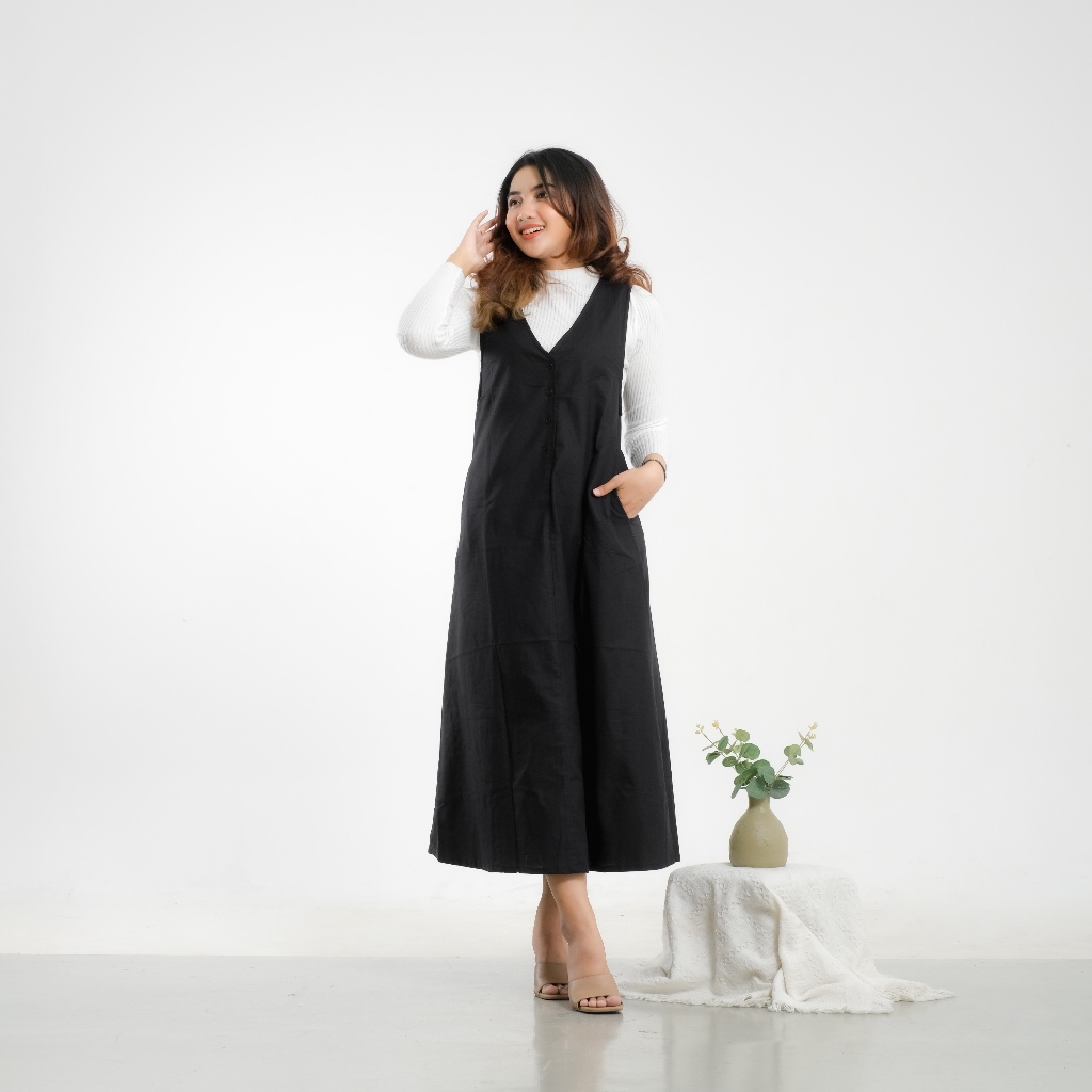 HAURA OVERALL POLOS LINEN LONG DRESS KOREAN LOOK KANCING DEPAN