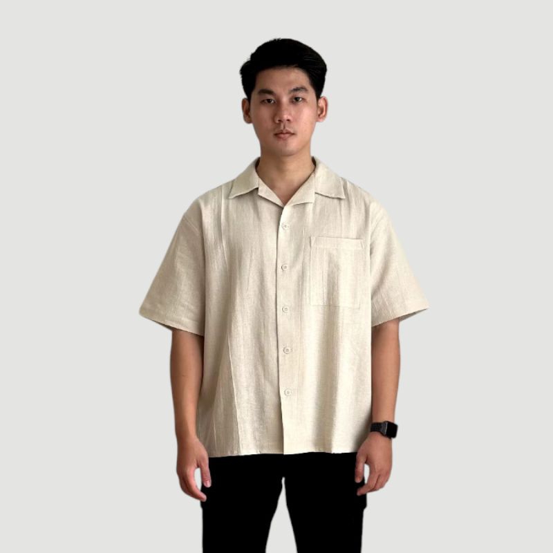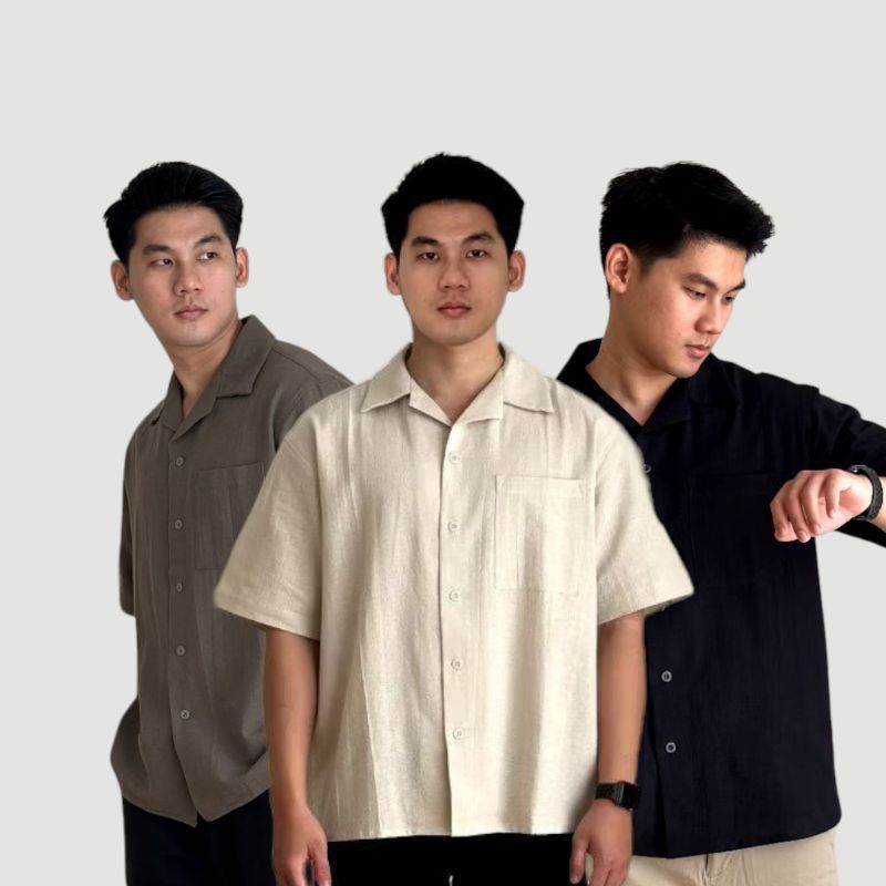 emeja FRAMMASSI Cuban Bowling Boxy Oversized Linen Shirt | emeja Linen Bowling Polos Pria erah Terbua Lengan Pende |