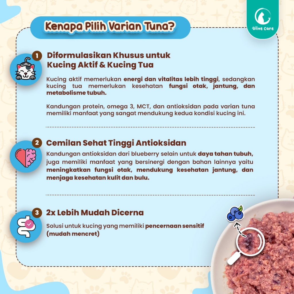 Olive Care SINGLE CREAMY TREATS 16gr & 20gr Snack Cemilan Kucing Bernutrisi dengan Daging Tuna/Salmon/Ayam Asli & Highbush Blueberry/Winter Squash/Red Spinach