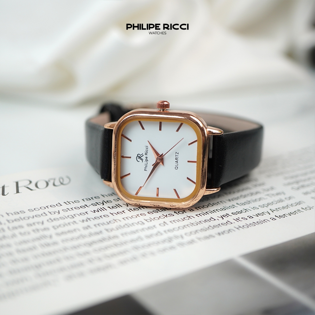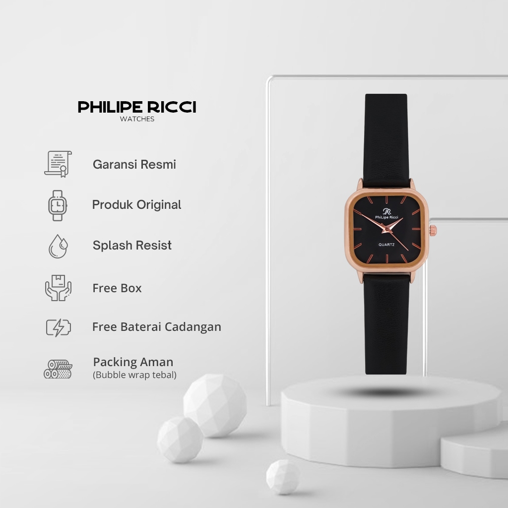 PhiLipe Ricci Jam Tangan Wanita Kulit Kecil Aesthetic Kotak Original 7487 Jam Cewek Mini Rose Hitam