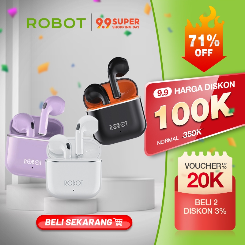 Robot TWS Wireless Earphone Airbuds T50S Original BT 6.0 True Wireless Headset Bluetooth Earbuds IPX4 WaterProof - Garansi 1 Tahun