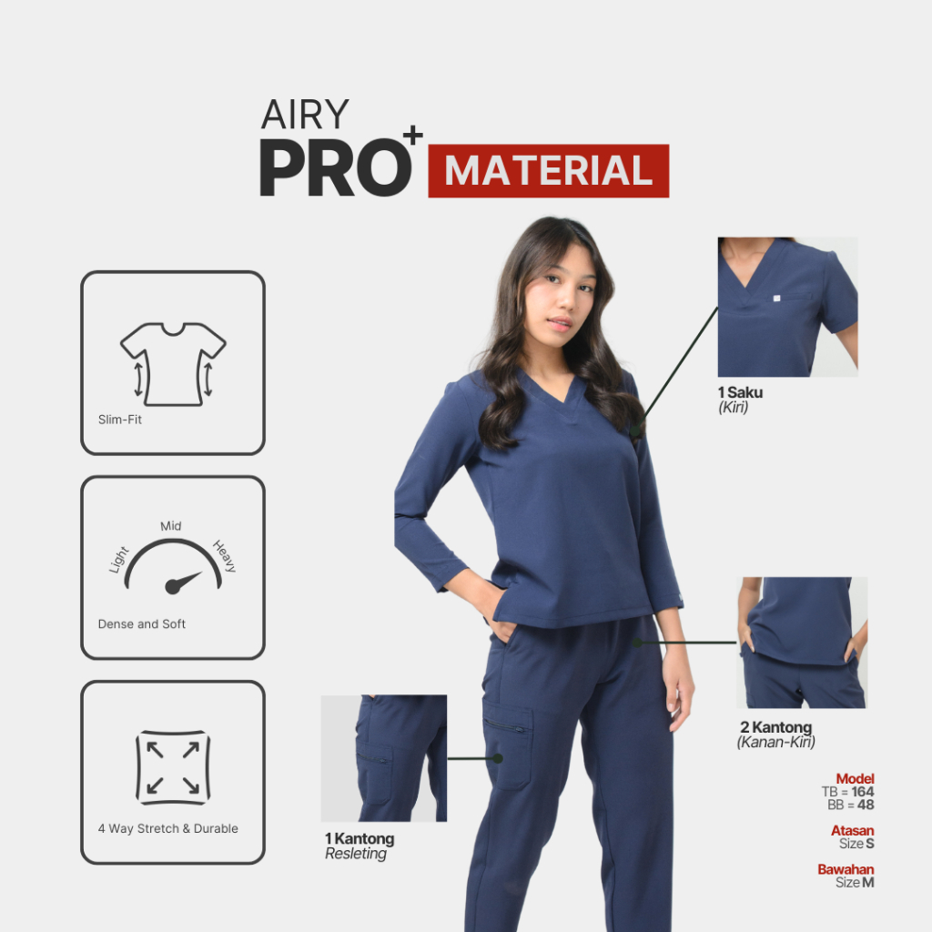 Set AIRY PRO+ STANDARD Warna 1 - Women Series Vneck Pendek & Panjang - Scrub Baju OK Stasis Medical Dokter Bidan Perawat