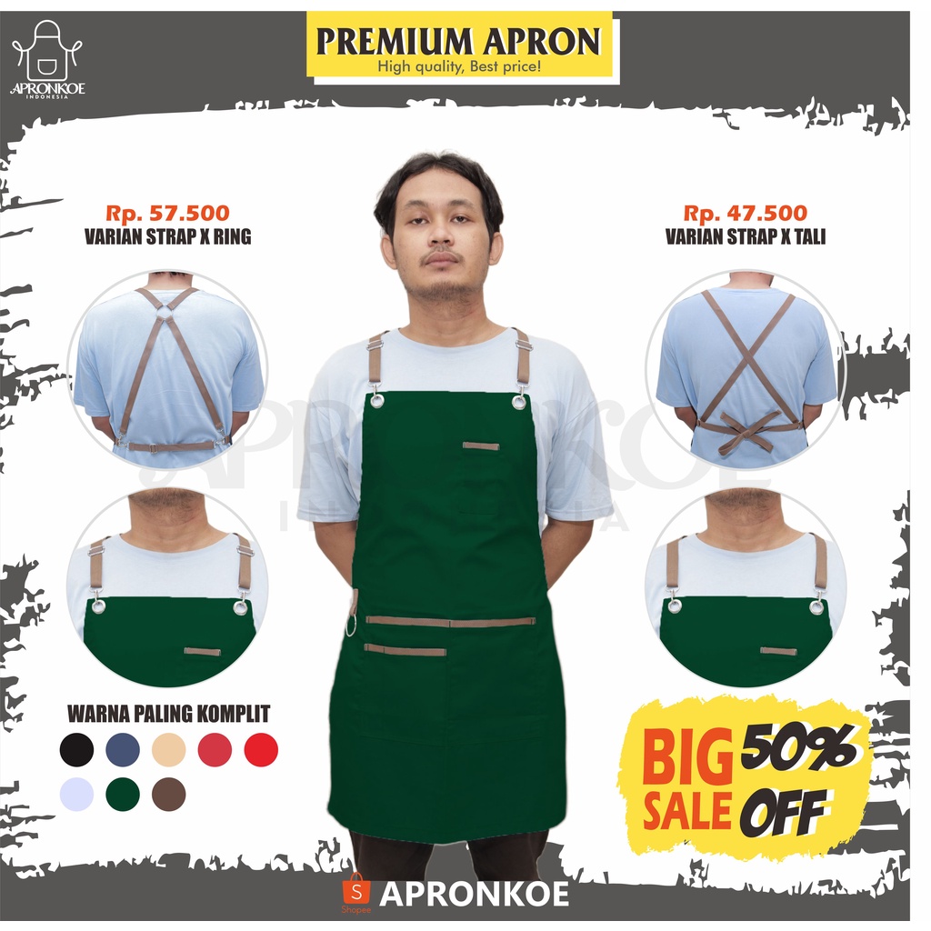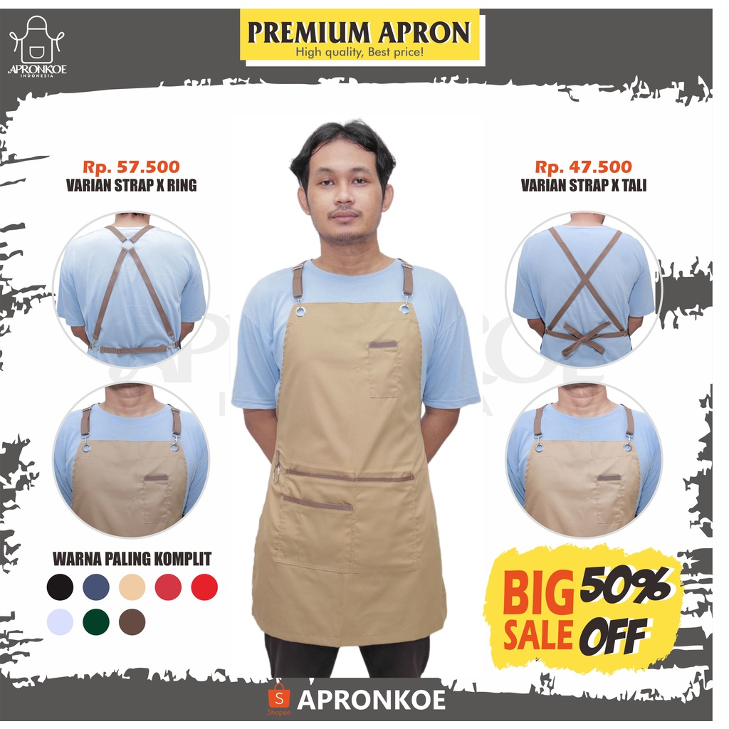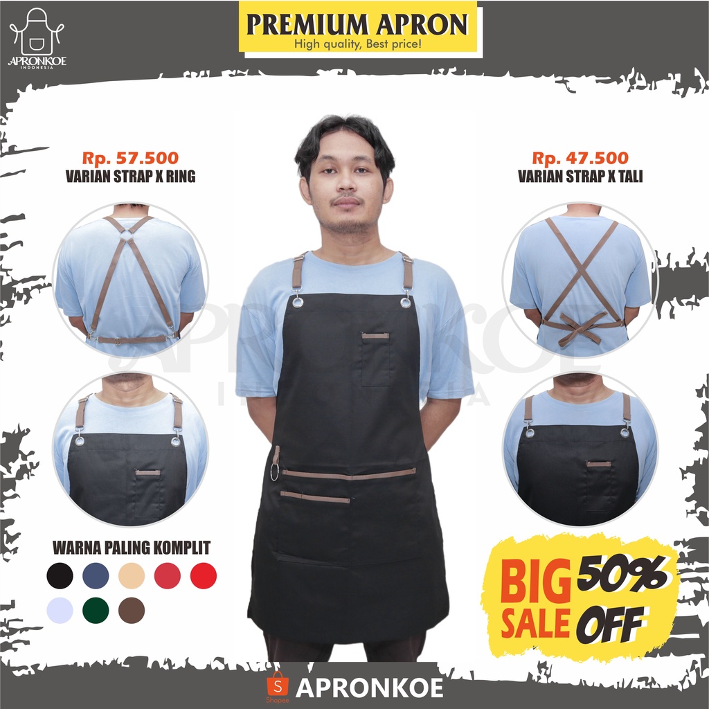 Apron celemek barista masak restoran cafe food drink chef barber waiter drill cotton strap ring strap x tali