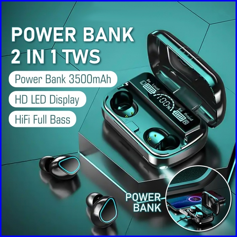 Ws-m10 Headset Bluetooth Full Bass Stereo 3500mah Power Bank Wireless Earphone Tahan Air Tws With Mic Headphones Handset