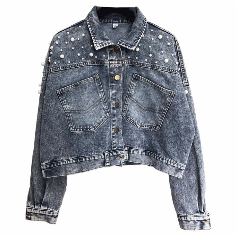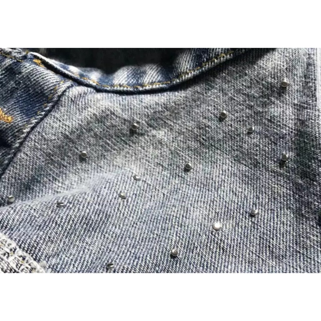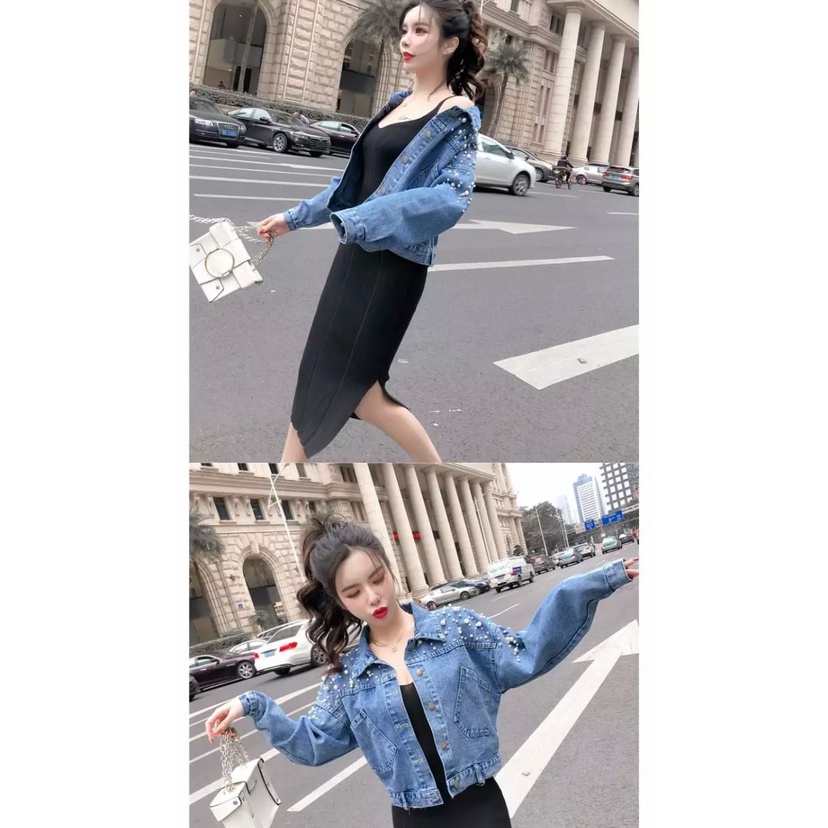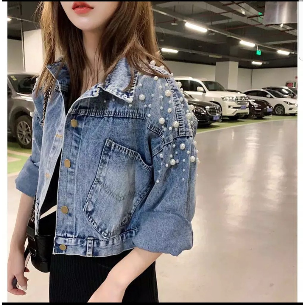 912 - JAKET JEANS CROP KOMBINASI MUTIARA TEMBAK OVERSIZE CROP
