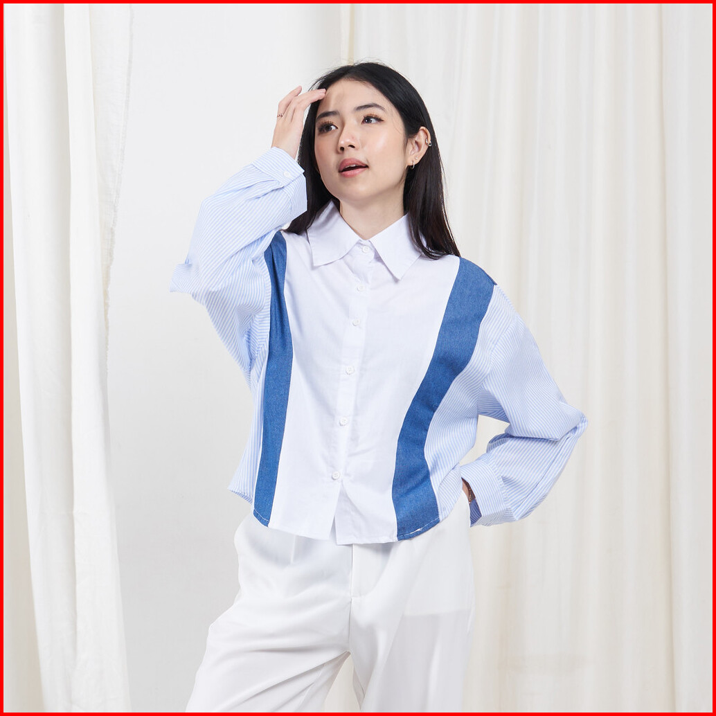 Queentin Kemeja Wanita Kombinasi 0748 Katun Twill Denim Chambray Polymicro Salur Lengan Panjang