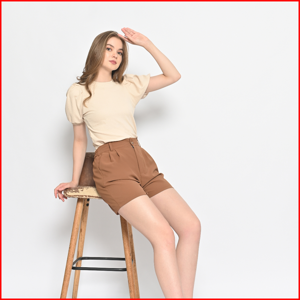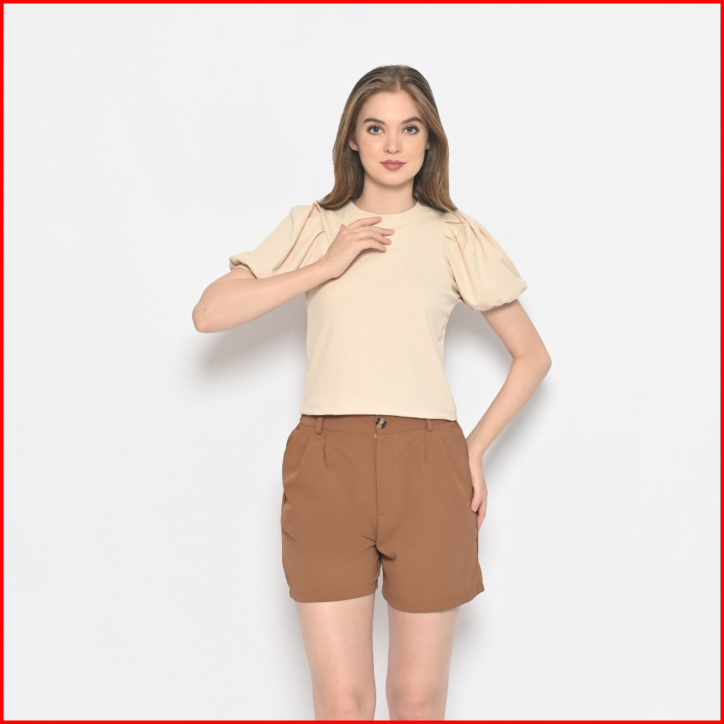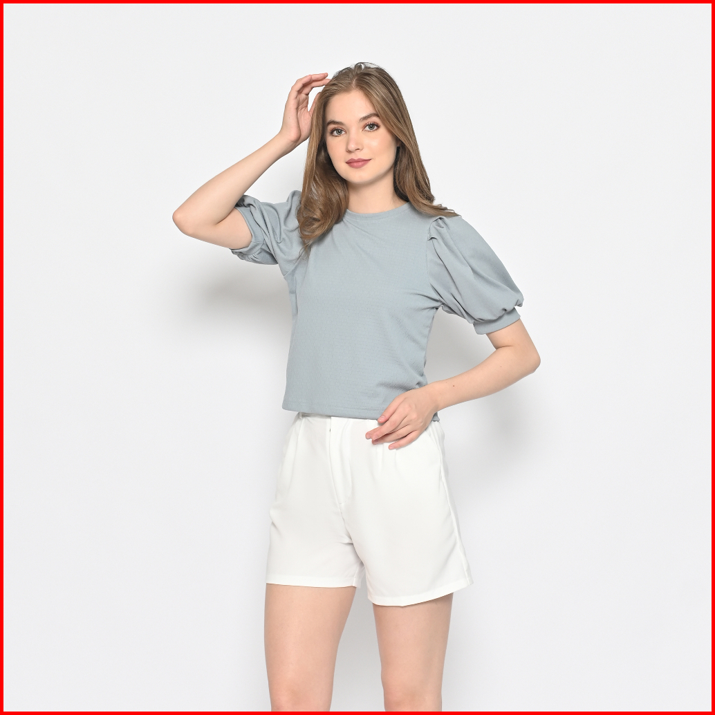 Queentin Kaos Crop Wanita 0282 Katun Knit Brickwork Vertical Stretch Lengan Pendek Balon Puff