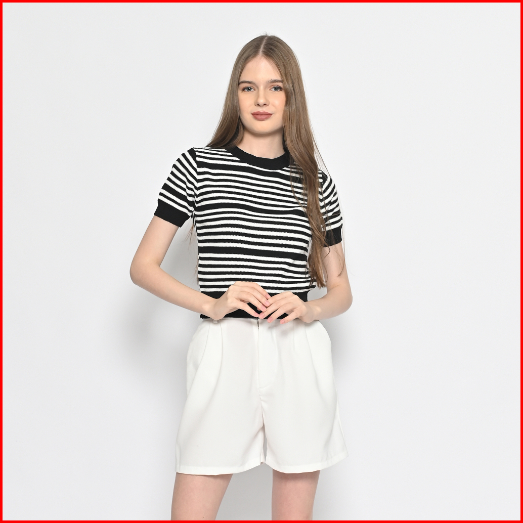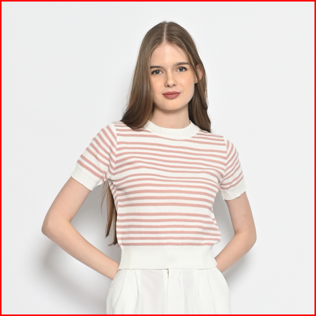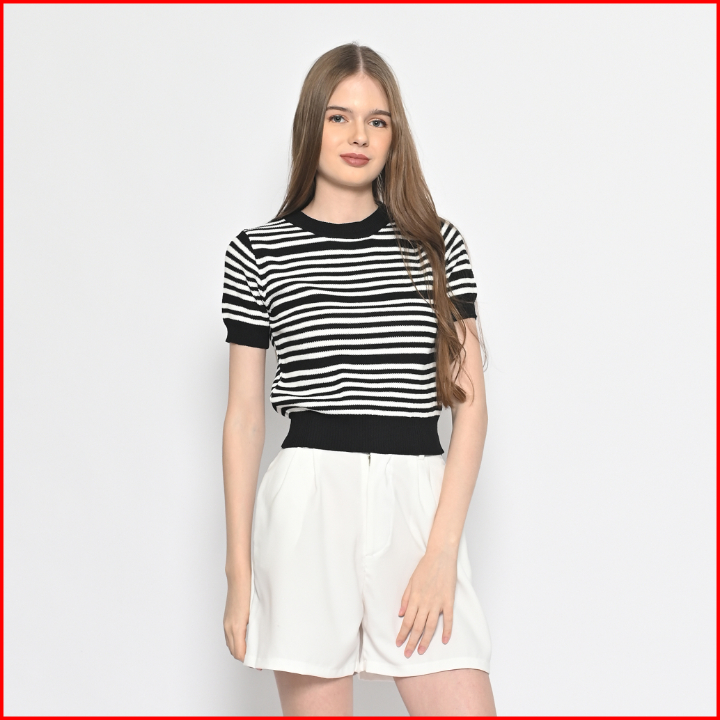Queentin Kaos Crop Wanita 2310 Rajut Knit Stripe Strecth Lengan Pendek