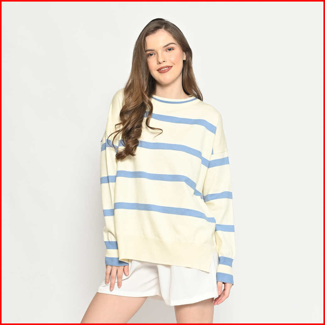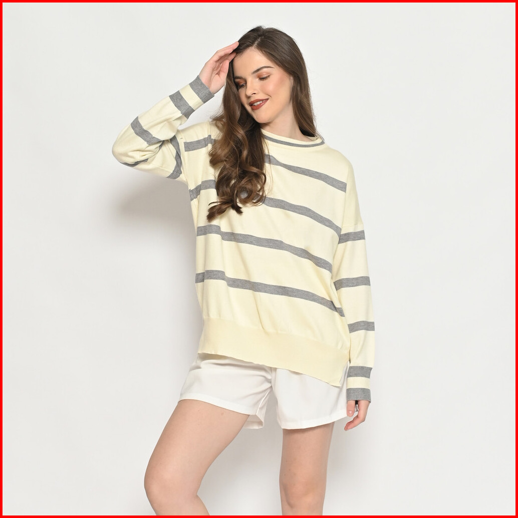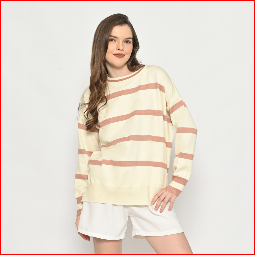 Queentin Sweater Wanita Rajut 457 Stretch Cashmere Knit Motif Salur Lengan Panjang