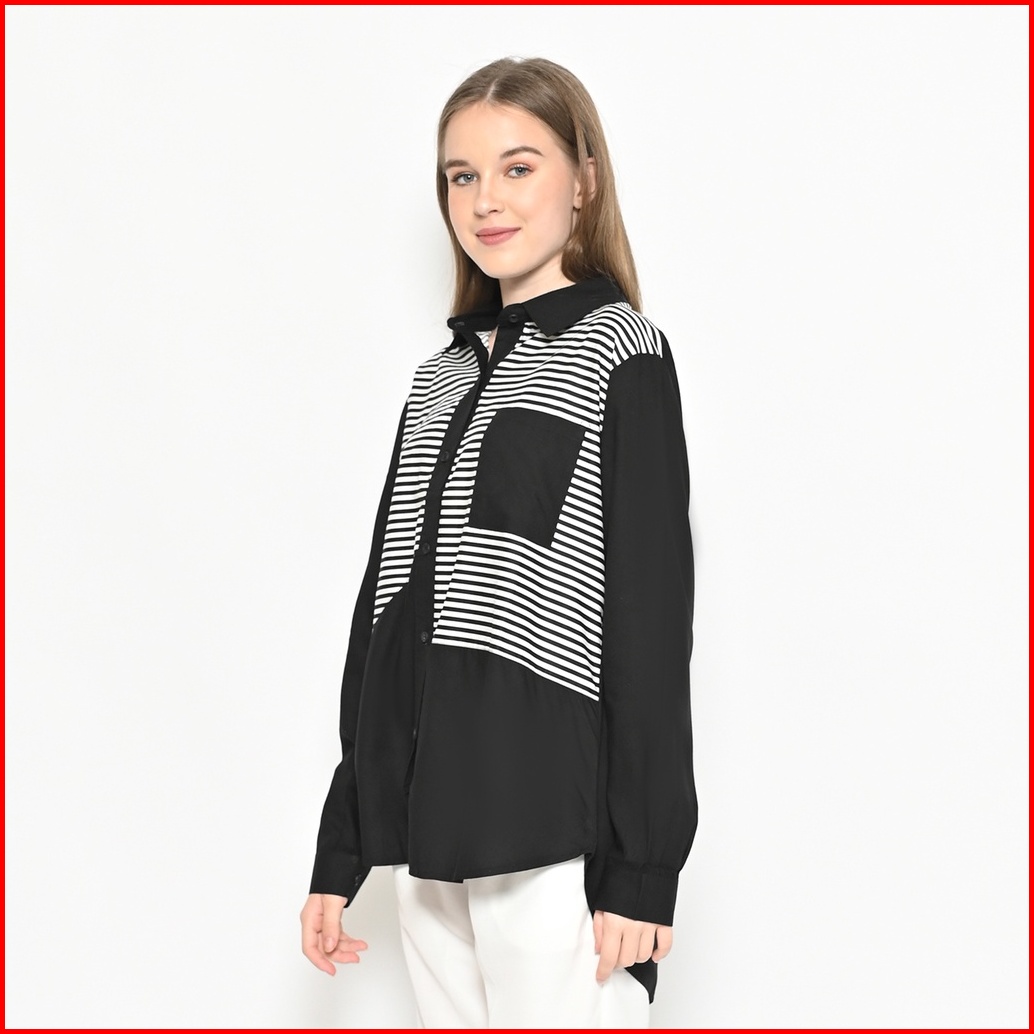 Queentin Kemeja Casual Wanita 0516 Katun Primacool Polos Kombinasi Stripe Premium Lengan Panjang