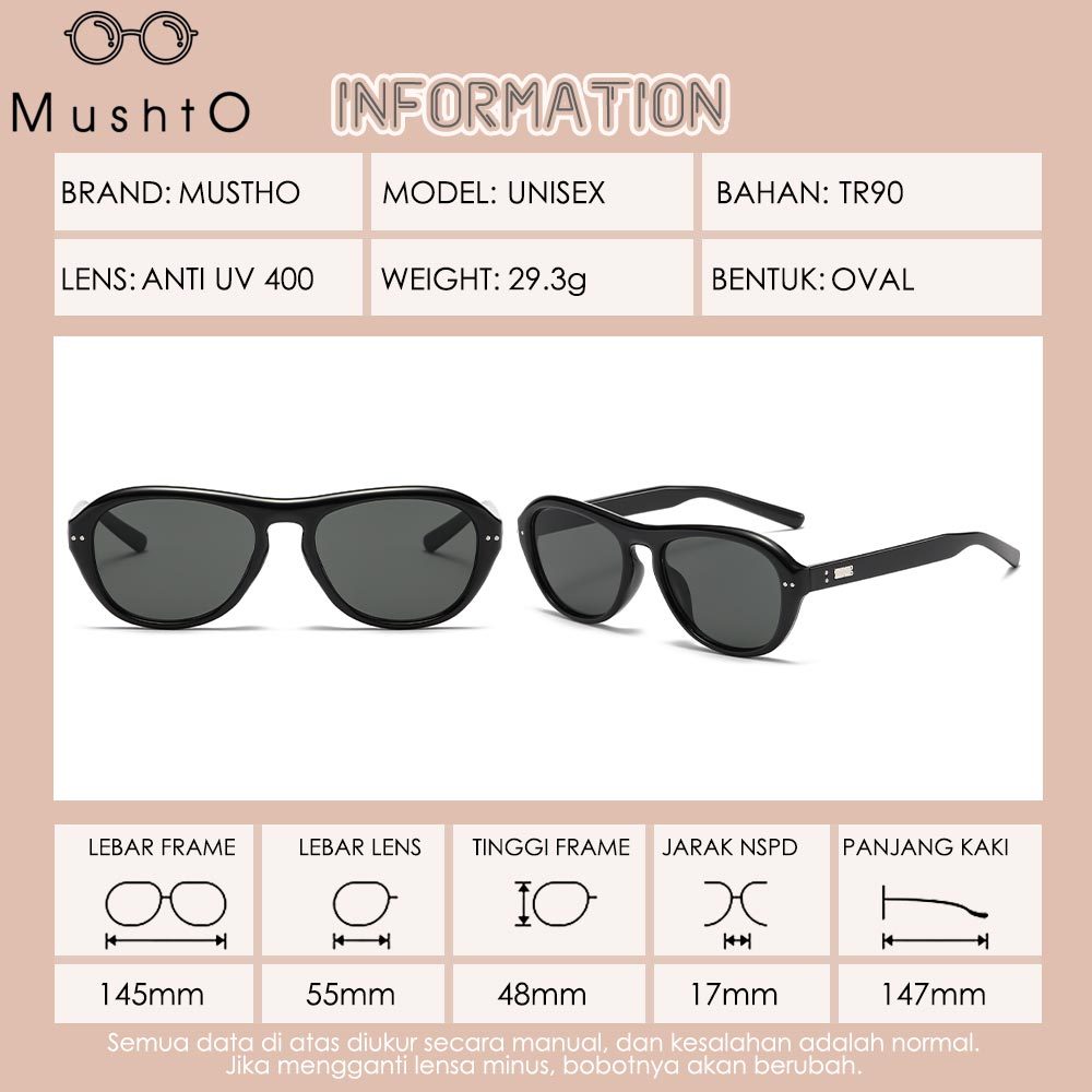 Mushto Kacamata Hitam Terbaru Design Oval Stylish Wanita dan Pria Bahan TR90 Lentur Anti UV 400 Lens G23