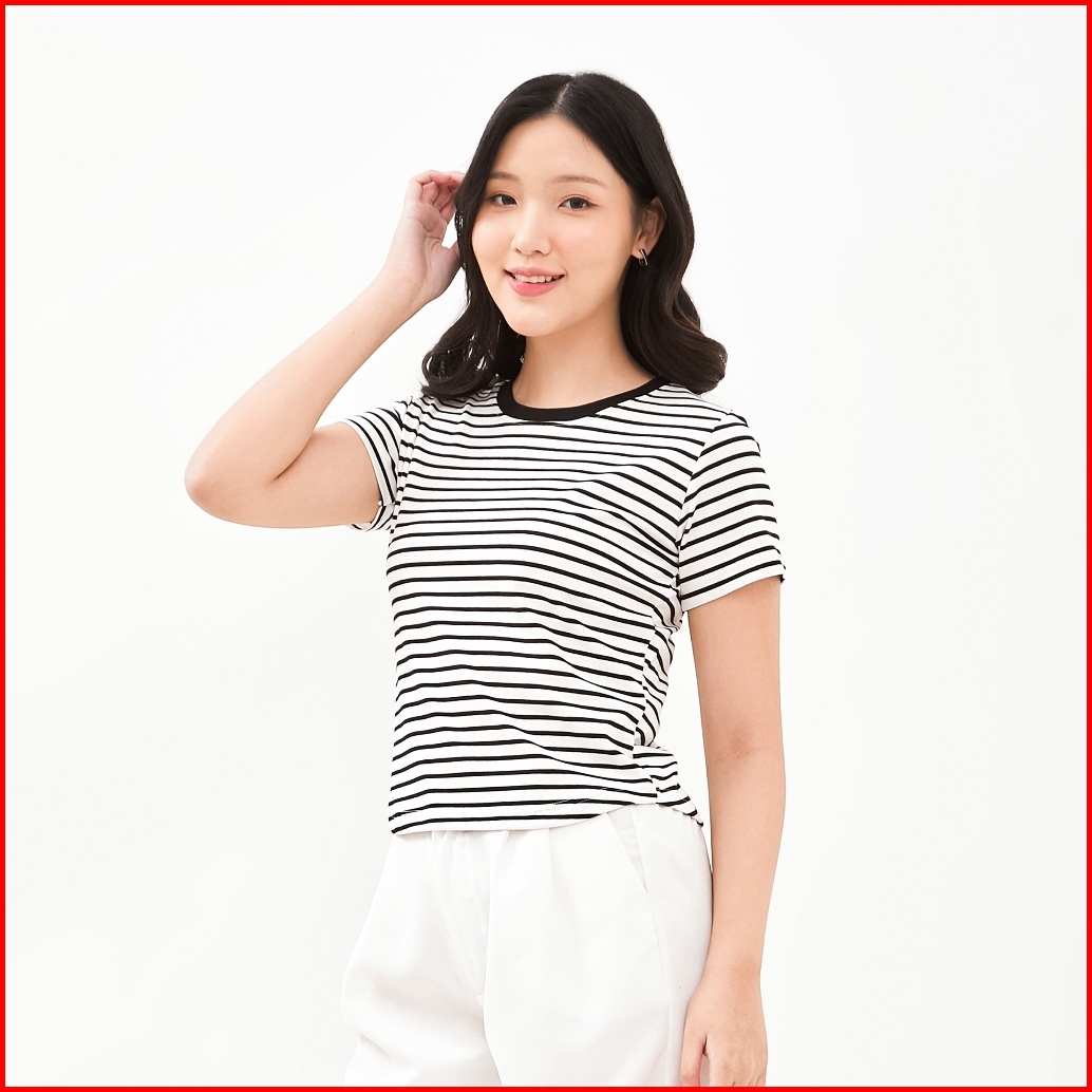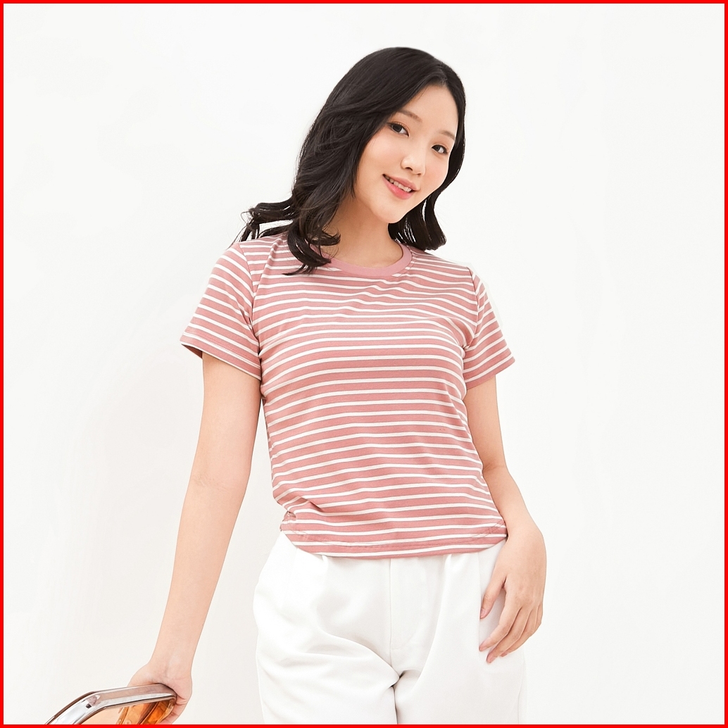 Queentin Kaos Wanita Casual 1041 Katun Spandex Motif Salur Lengan Pendek
