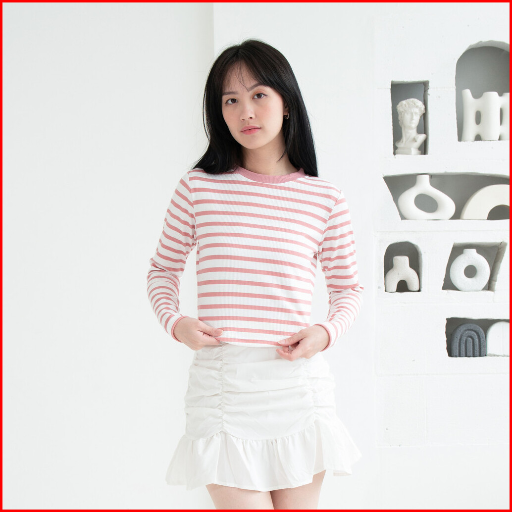 Queentin Kaos Wanita Curve Hem 0673 Stretch Caramel Knit Motif Salur Lengan Panjang