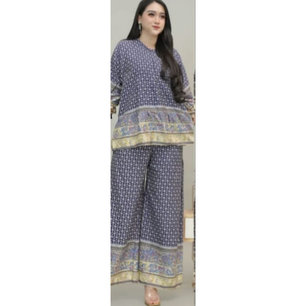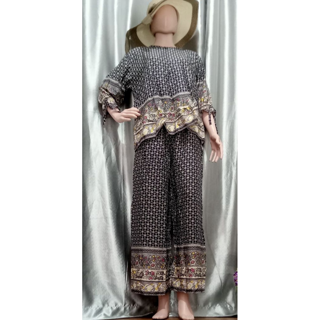 One Set Wanita Kekinian Setelan Rayon Susun Celana Kulot Lengan 7/8 Setelan Jumbo Bahan Rayon