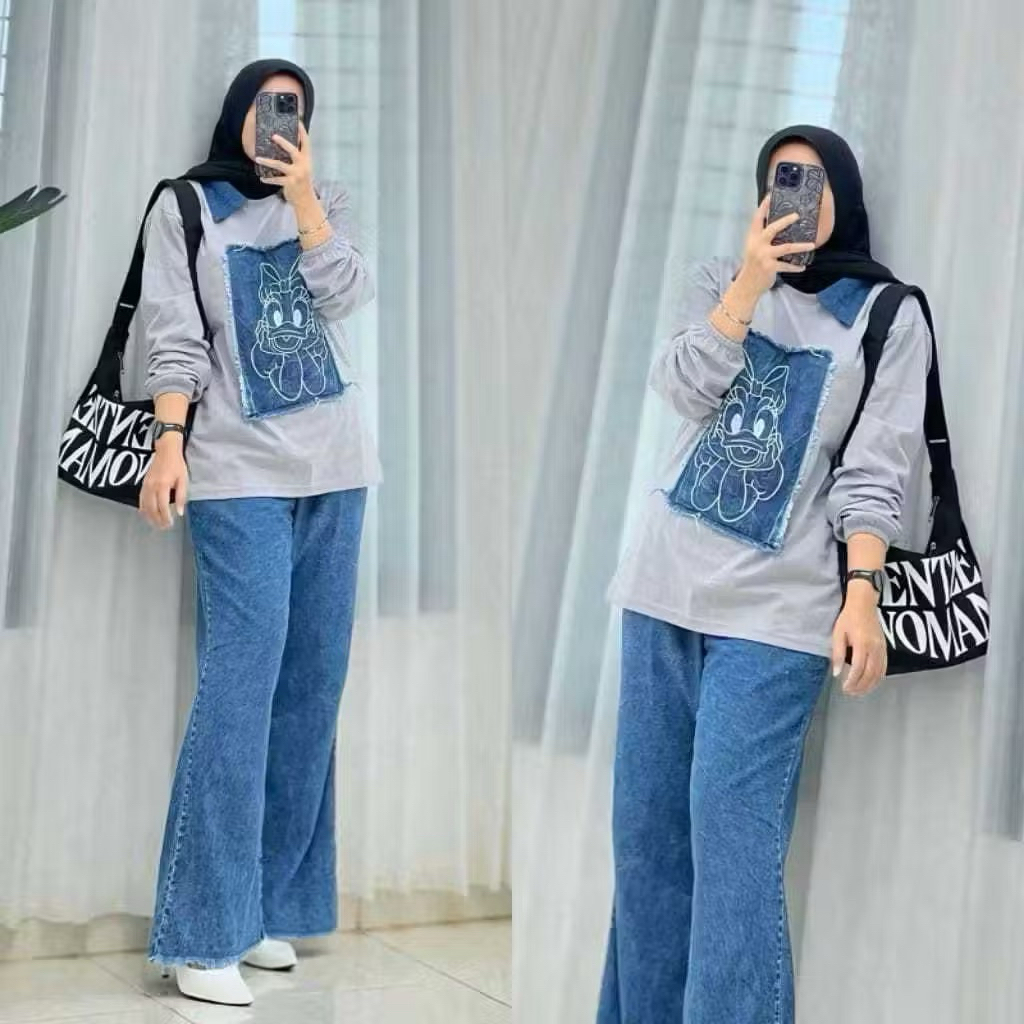 Oneset Donna Set Setelan Jeans Kulot Wanita, Atasan Combed 24s Variasi Serut Samping, Celana Jeans Kulot, Setelan Jeans Wanita Terpopuler