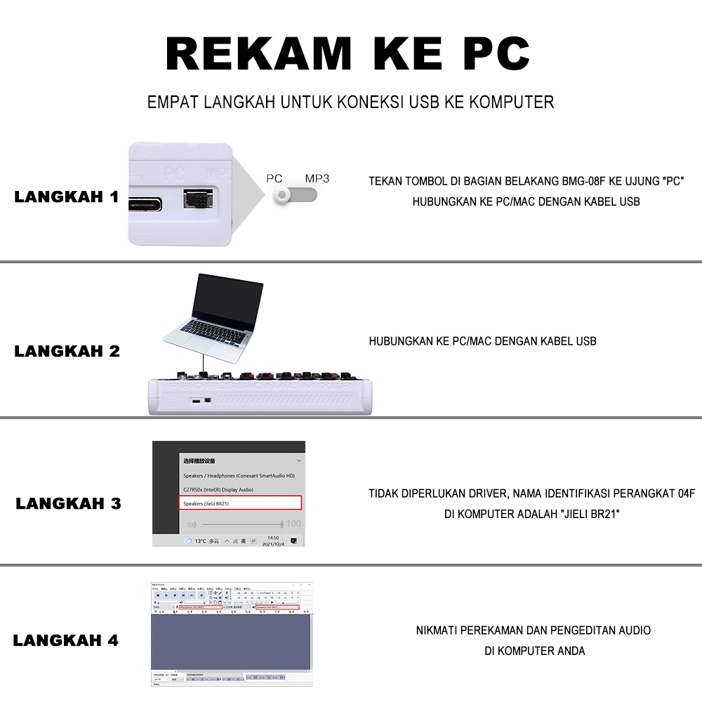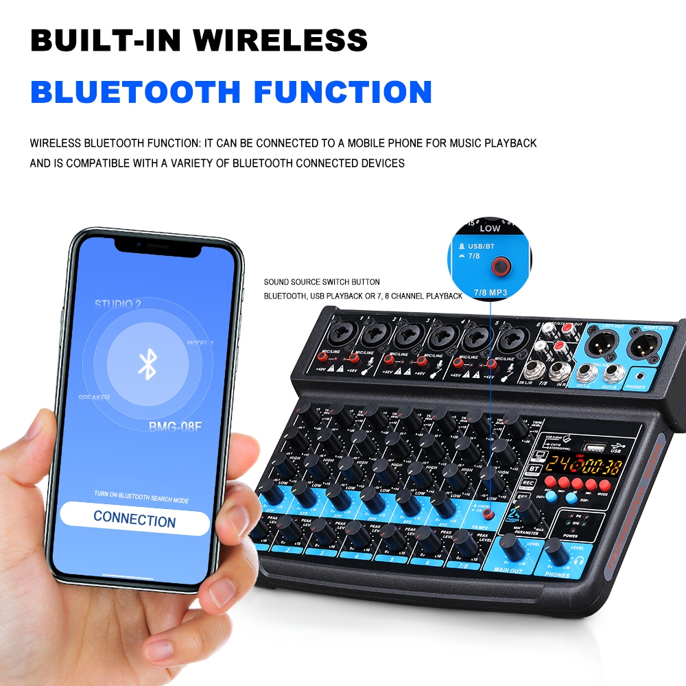BOMGE 08F Audio Mixer, Professional DJ Mixer 8Channel DJ Controller Sound Mixer DSP Compatible Bluetooth, USB Port, 48V