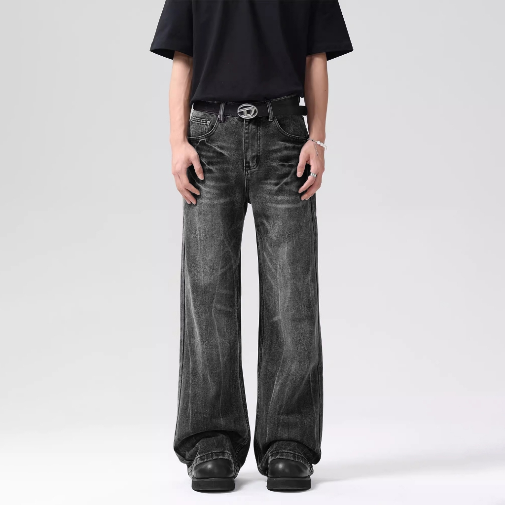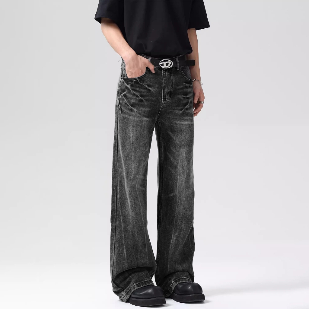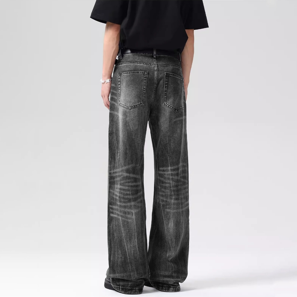 Celana Jeans Pria Hitam Washed - Retro Amerika Motif Petir & Cut Boot