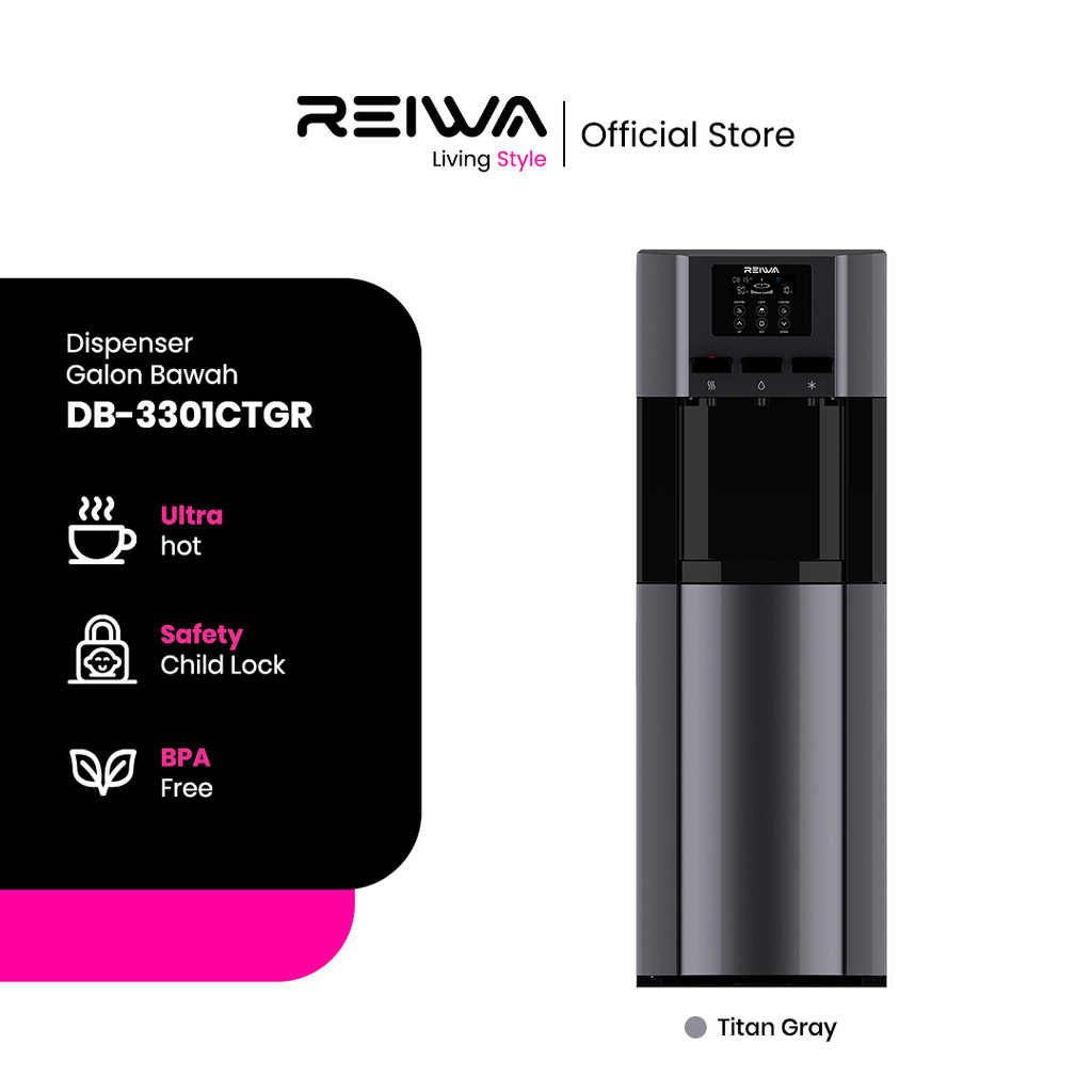 DISPENSER GALON BAWAH REIWA DB3301CTGR GREY AIR NORMAL PANAS DINGIN COOL HOT LOW WATT STANDING BERGARANSI MURAH