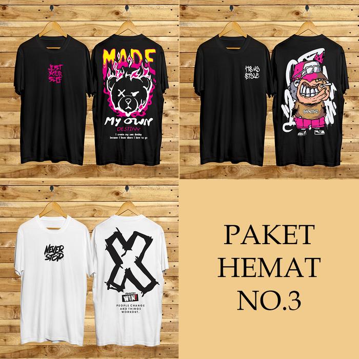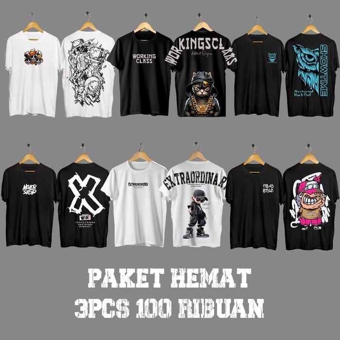 Baju Kaos Tshirt Distro Pria Cowok PAKET HEMAT 3PCS 100 RIBUAN Motif Sablon Lengan Dan Depan