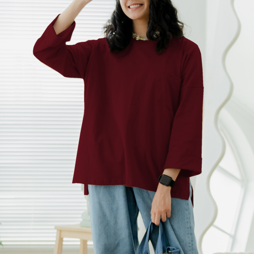 ANSSY - Rumi Oversize Pocket Tshirt Burgundy - Kaos Lengan Panjang Wanita