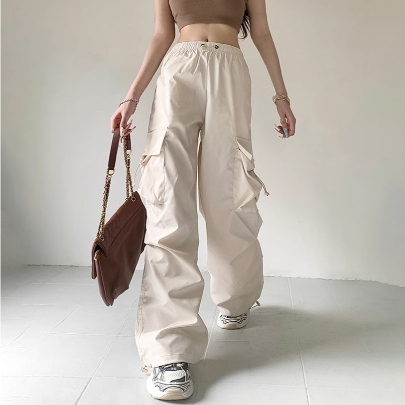 Celana Cargo Cepat Kering Serut Saku Retro Gaya untuk Wanita Celana Olahraga Kasual Tirai Longgar