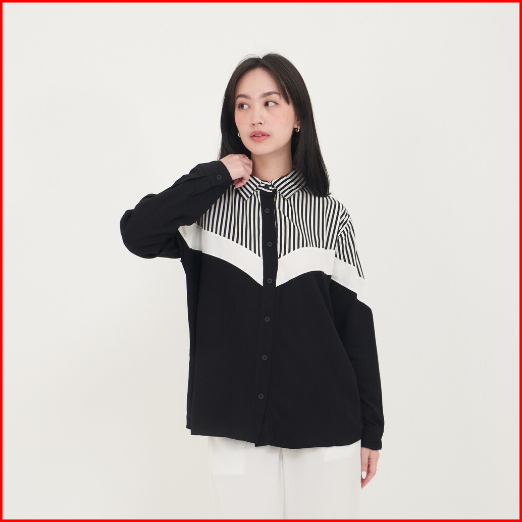 Queentin Kemeja Wanita Kombinasi 0751 Rayon Viscose Polos Mix Katun Salur Lengan Panjang