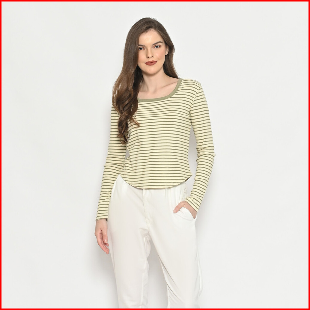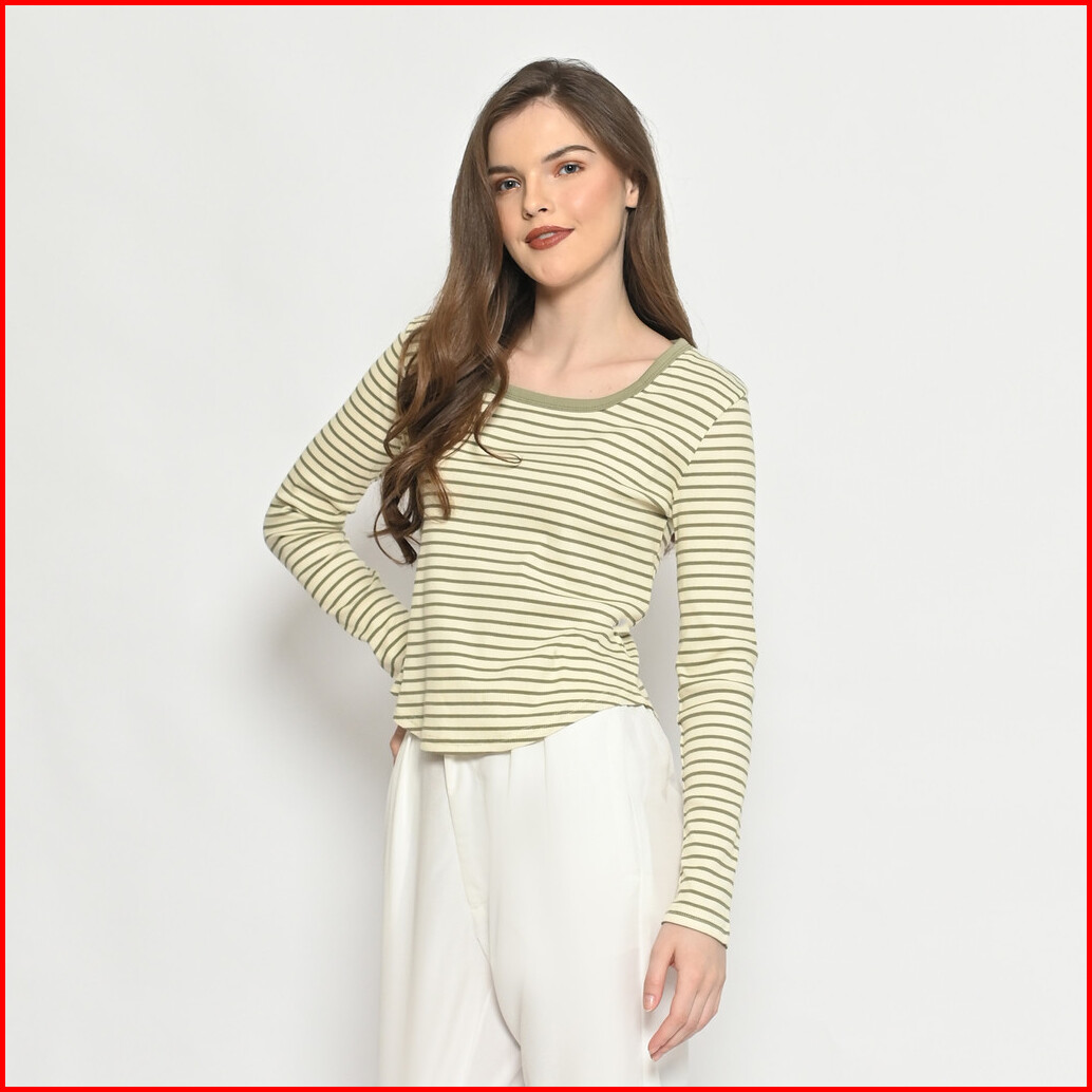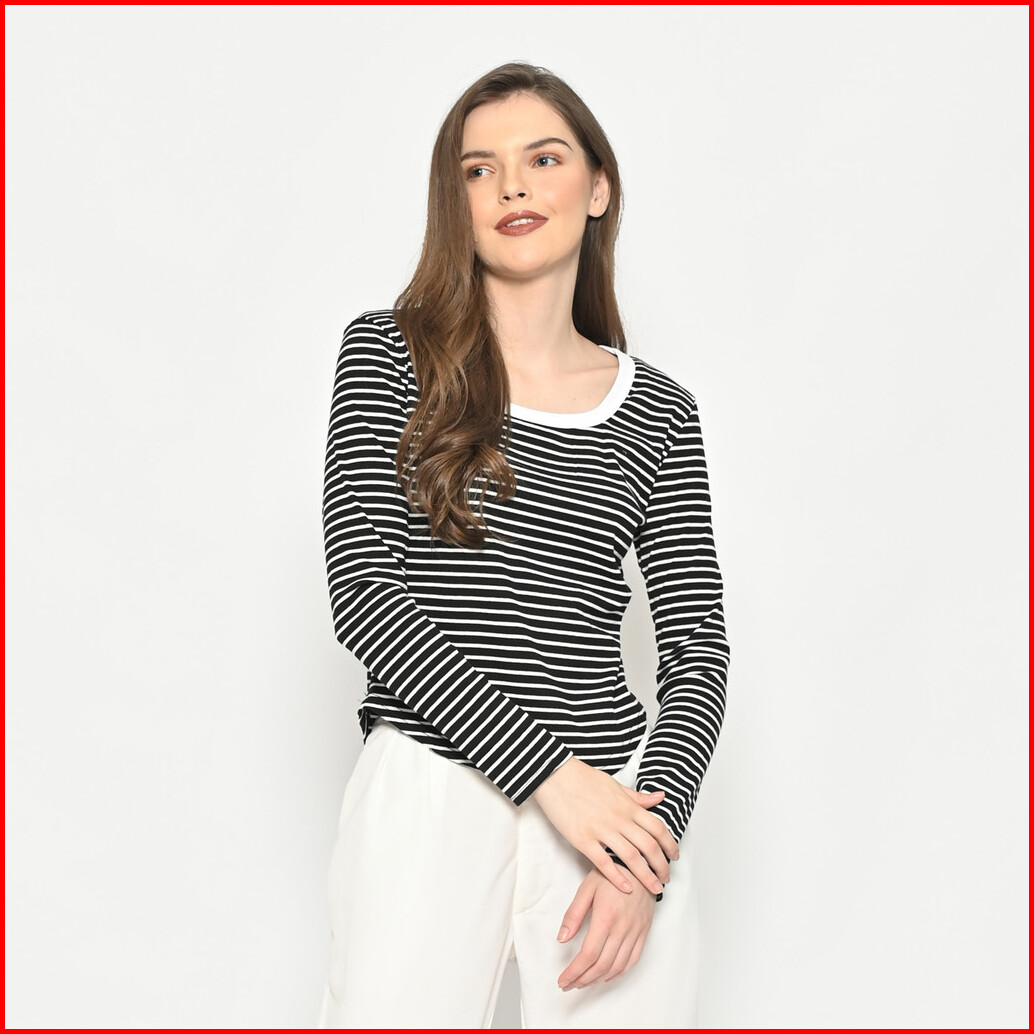 Queentin Kaos Wanita Curve Hem 3559-1 Stretch Rib Knit Motif Salur Lengan Panjang