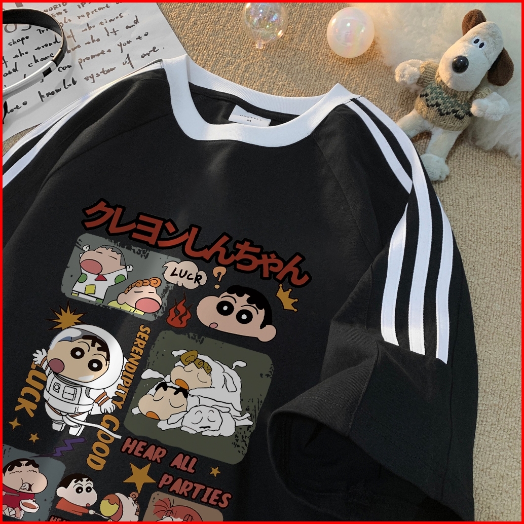 Forteid Cetakan Kaos Olahraga Hitam Crayon Shinchan Yang Lucu Kaos Putih Baju Oversize Bergaris Bahu Korean Style Kaos L