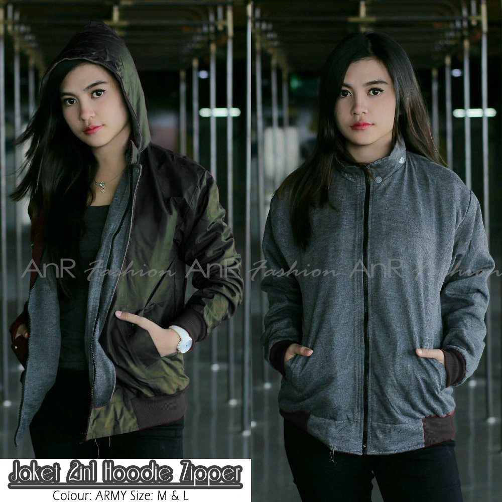 Jaket Bolak Balik 2in1 Bomber Parasut Fleece Hoodie Wanita Murah Kualita- Hitam/Navy/Maroon/Army/Abu