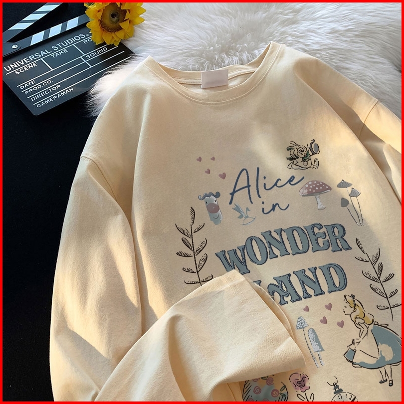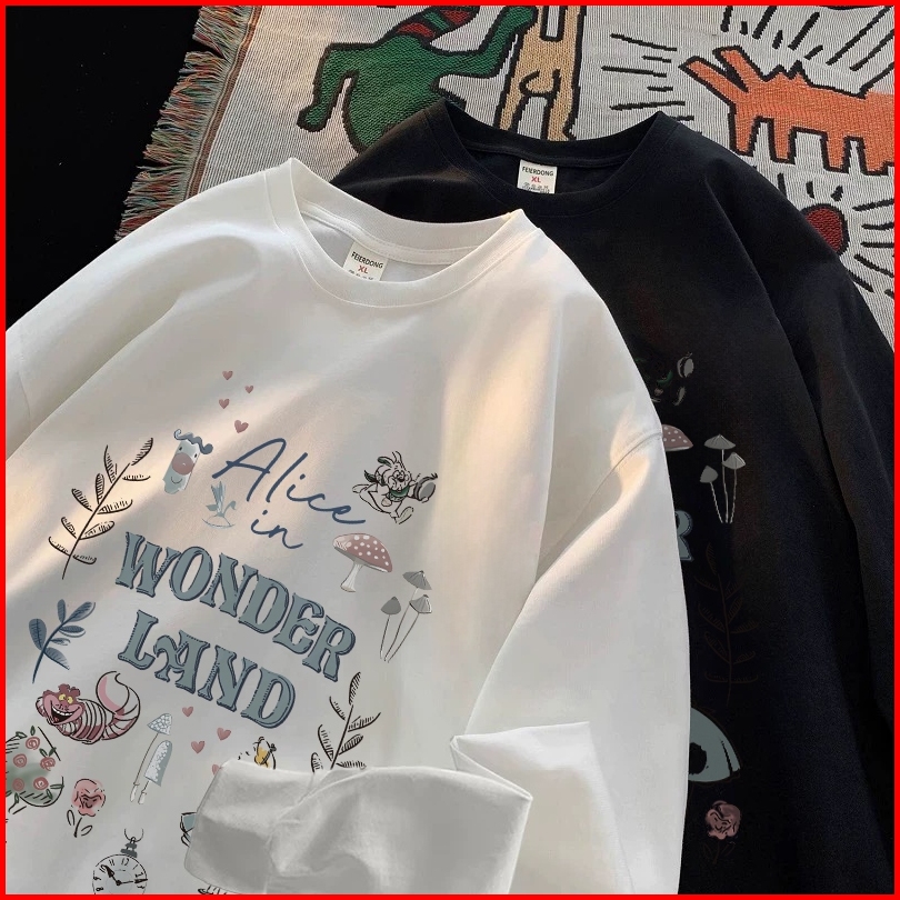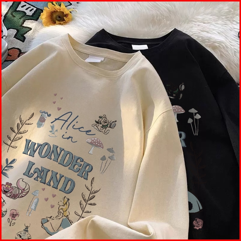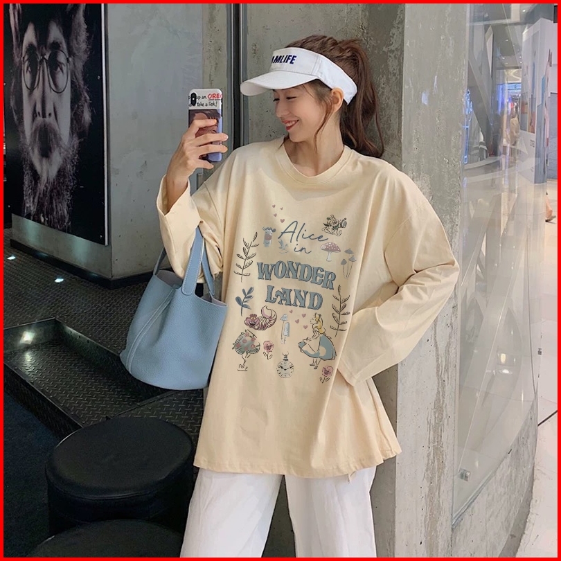 Forteid Atasan Kaos Wanita Oversize Lengan Panjang Korean Style Alice In Wonderland Lucy Baju Kaos Polos Cotton Combed P
