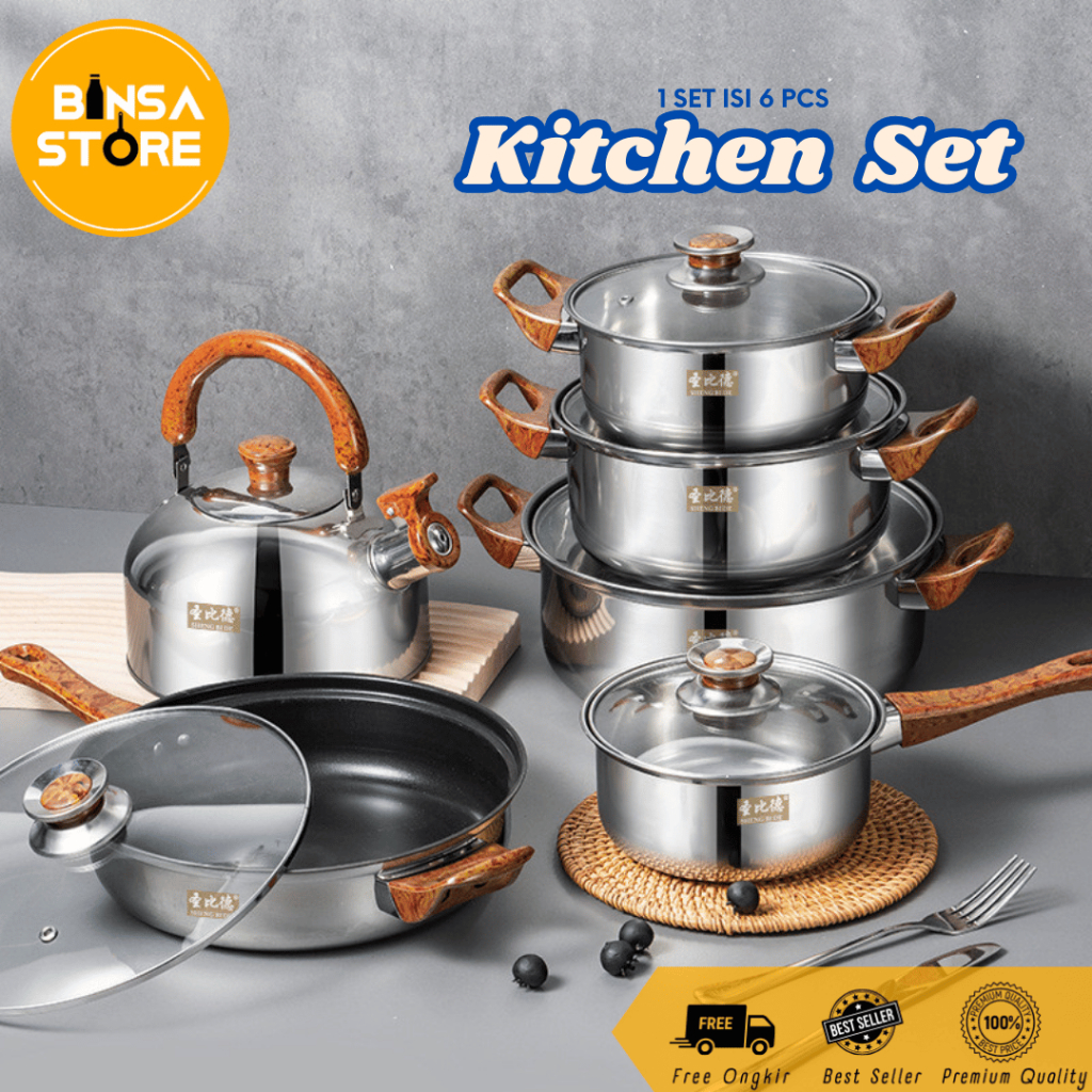 Stainless Cookware Set Isi 5 Macam Peralatan Masak Lengkap Pegangan Kayu Kuali Frying Pan - 270A