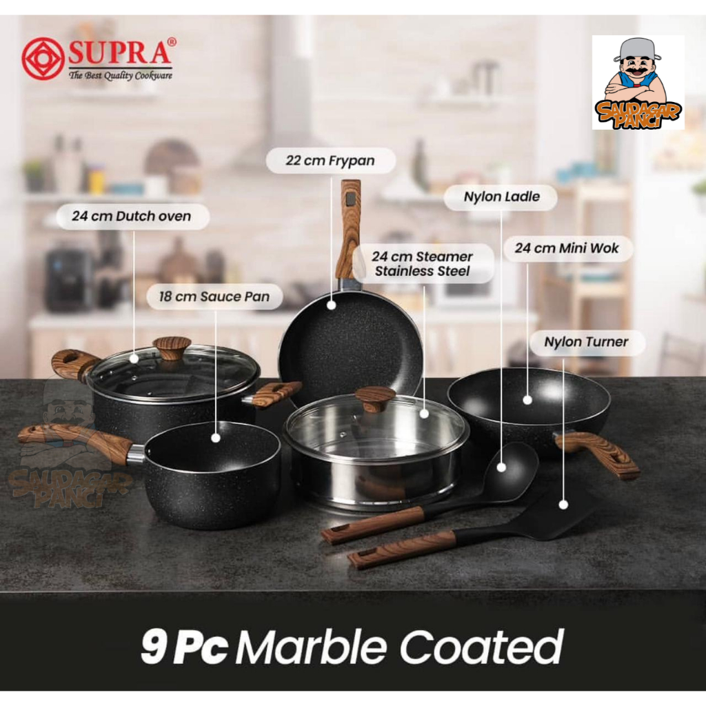 Panci Set Supra 9 pc / SUPRA RENATTA MOELOEK 9 pc / Alumunium Anti lengket Marble Coated (Wooden)