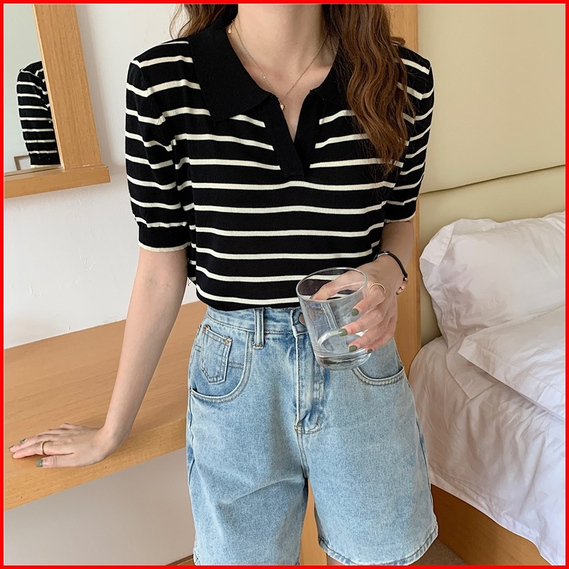 Yiyi Girl Kaos Rajut Wanita Bergaris Lengan Pendek Sweater Crop Top