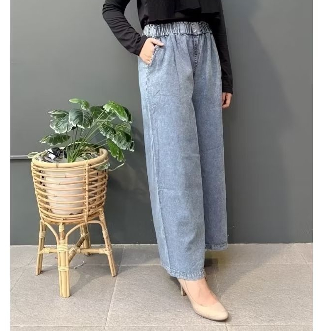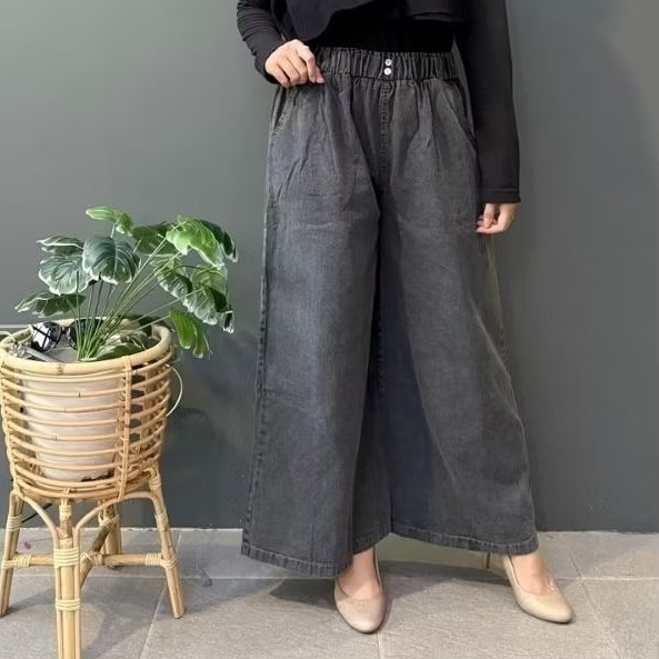 Celana Kulot Jeans Jumbo Wanita Panjang 94cm Pinggang Karet Fit BB 43-80KG Lezahrasignature Cullote Soft Denim Keyla
