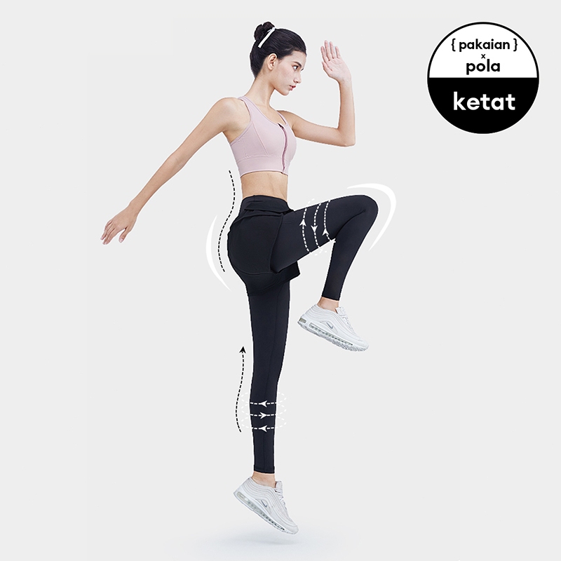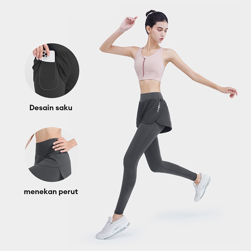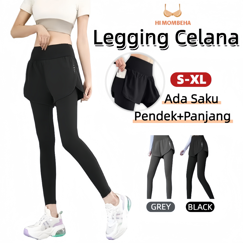 2 In 1 Celana Olahraga Wanita Pendek+Panjang Ada Saku Running Yoga Gym Sportwear Legging C0011G4