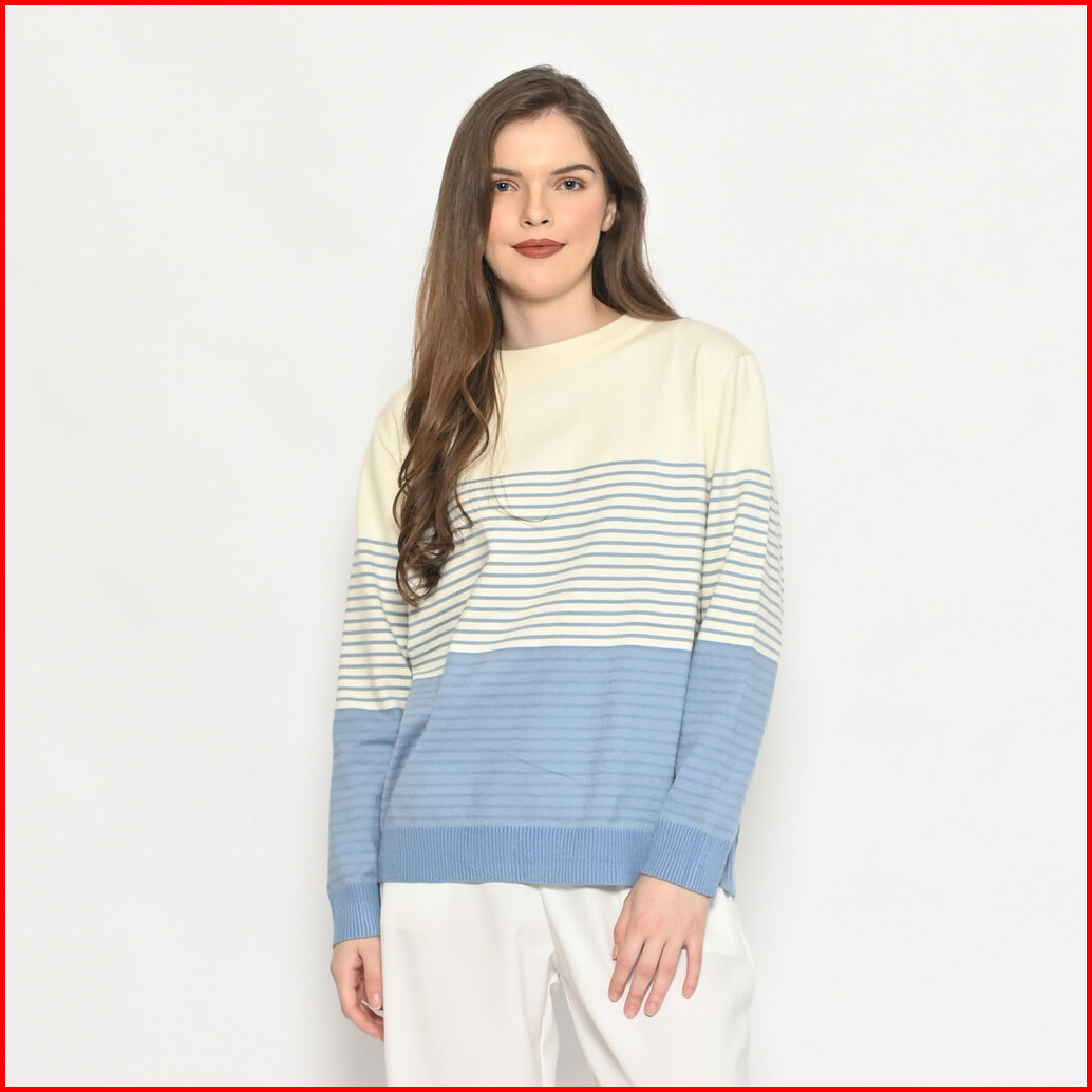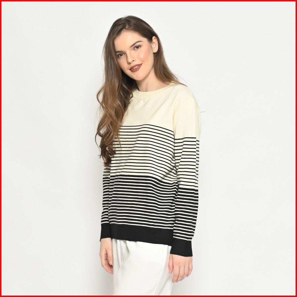 Queentin Sweater Wanita Rajut 446 Stretch Cashmere Knit Motif Salur Lengan Panjang
