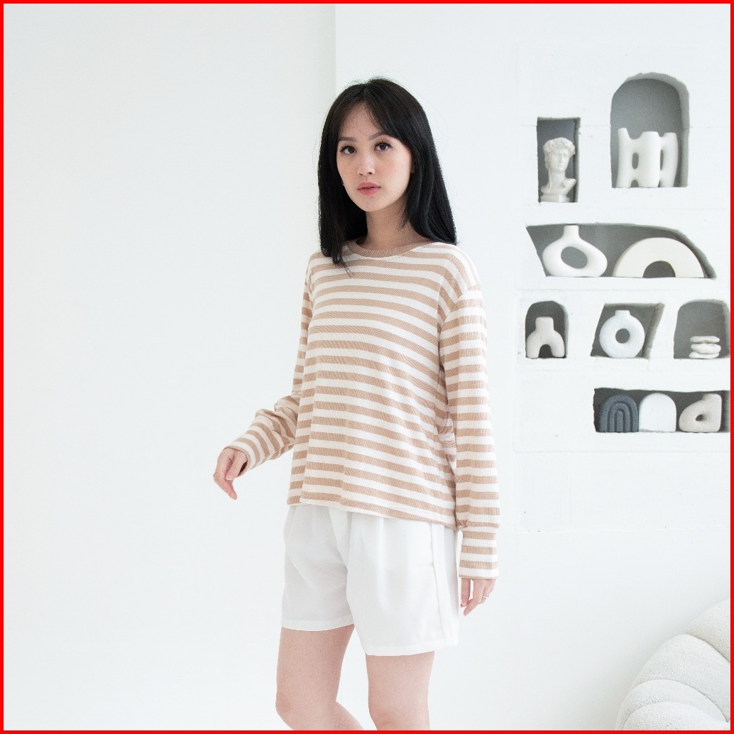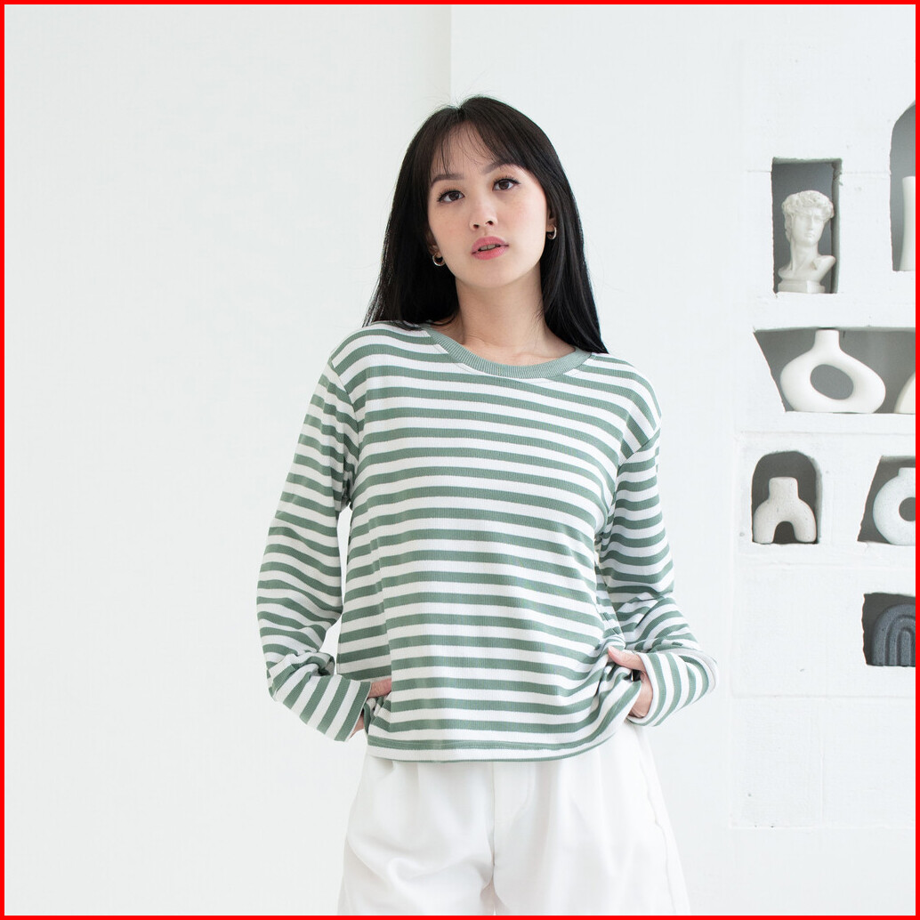 Queentin Kaos Crewneck Wanita 0672 Stretch Yeona Rib Knit Motif Salur Lengan Panjang